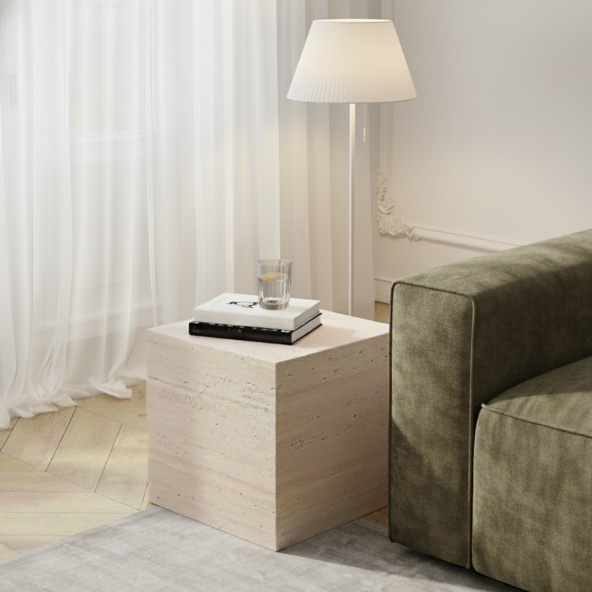 The Alessia Plinth is sculpted from solid travertine, offering an understated statement in stone.
