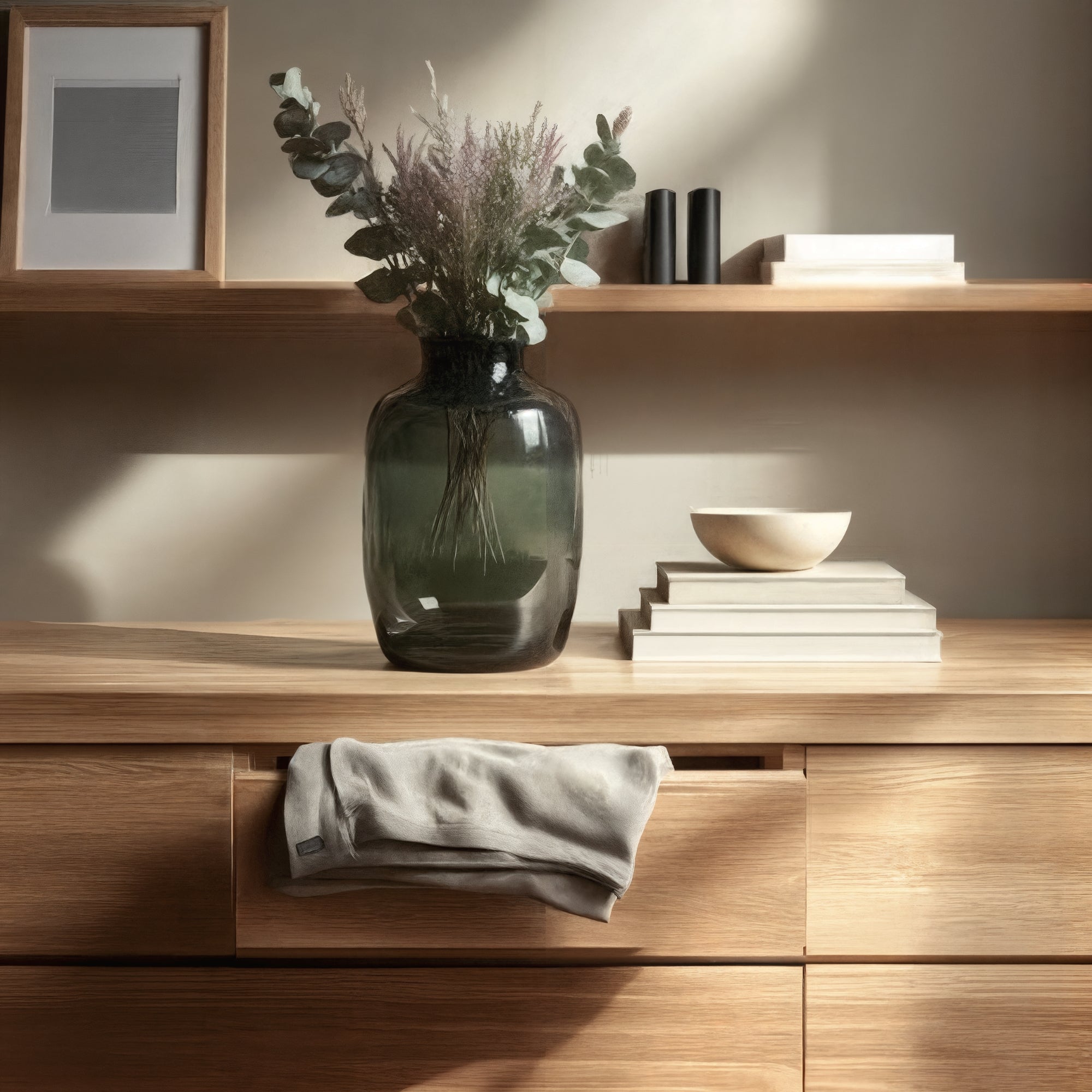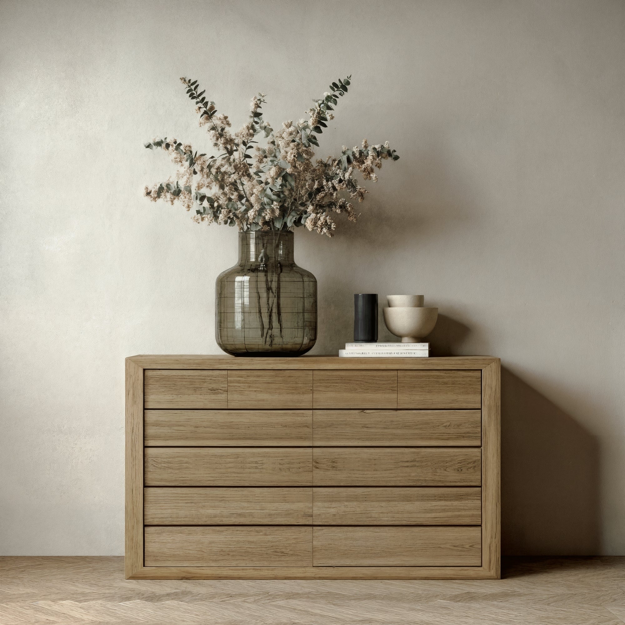 The Ashford Dresser offers a clean-lined profile with 12 flush-set drawers, crafted from solid oak for structured storage and visual symmetry.