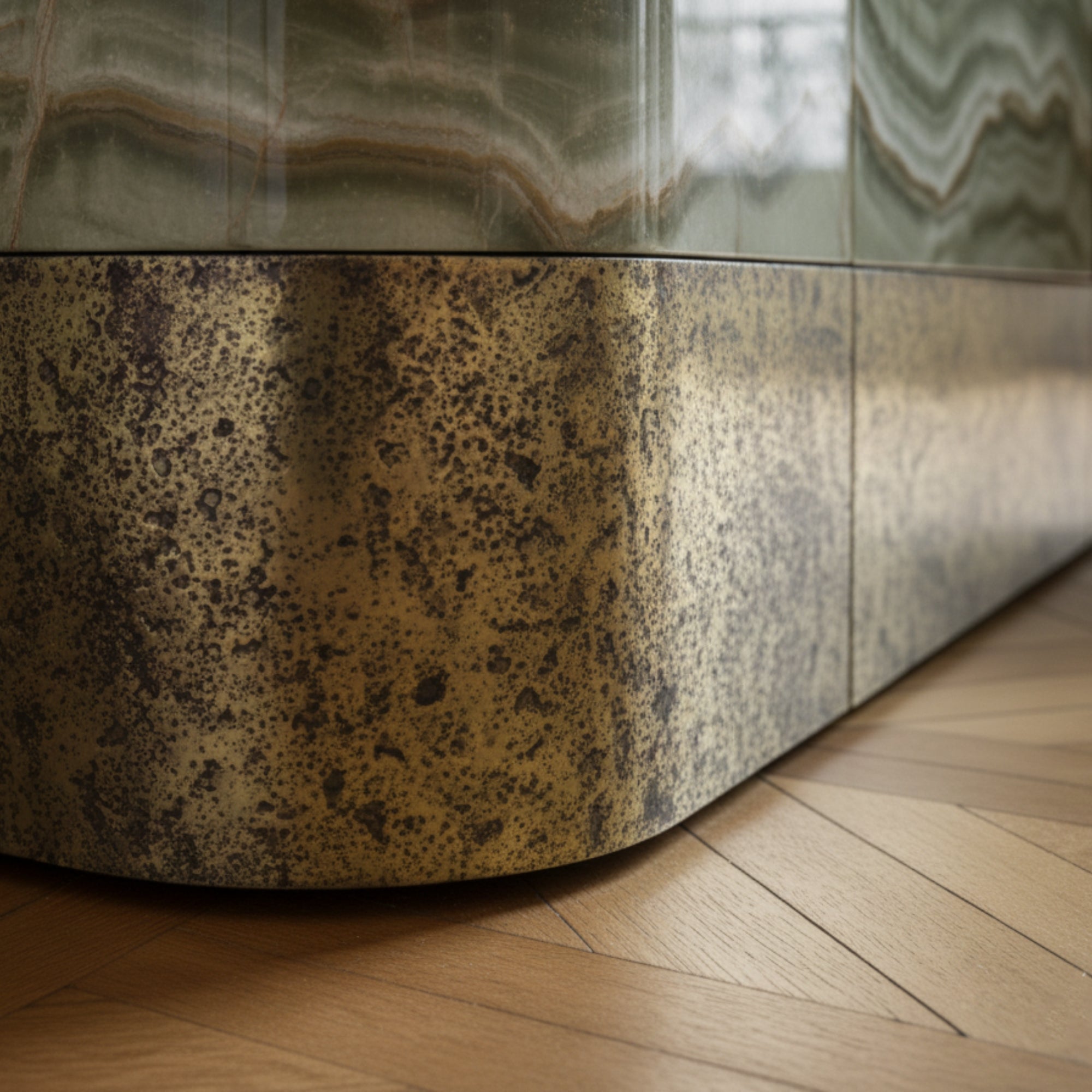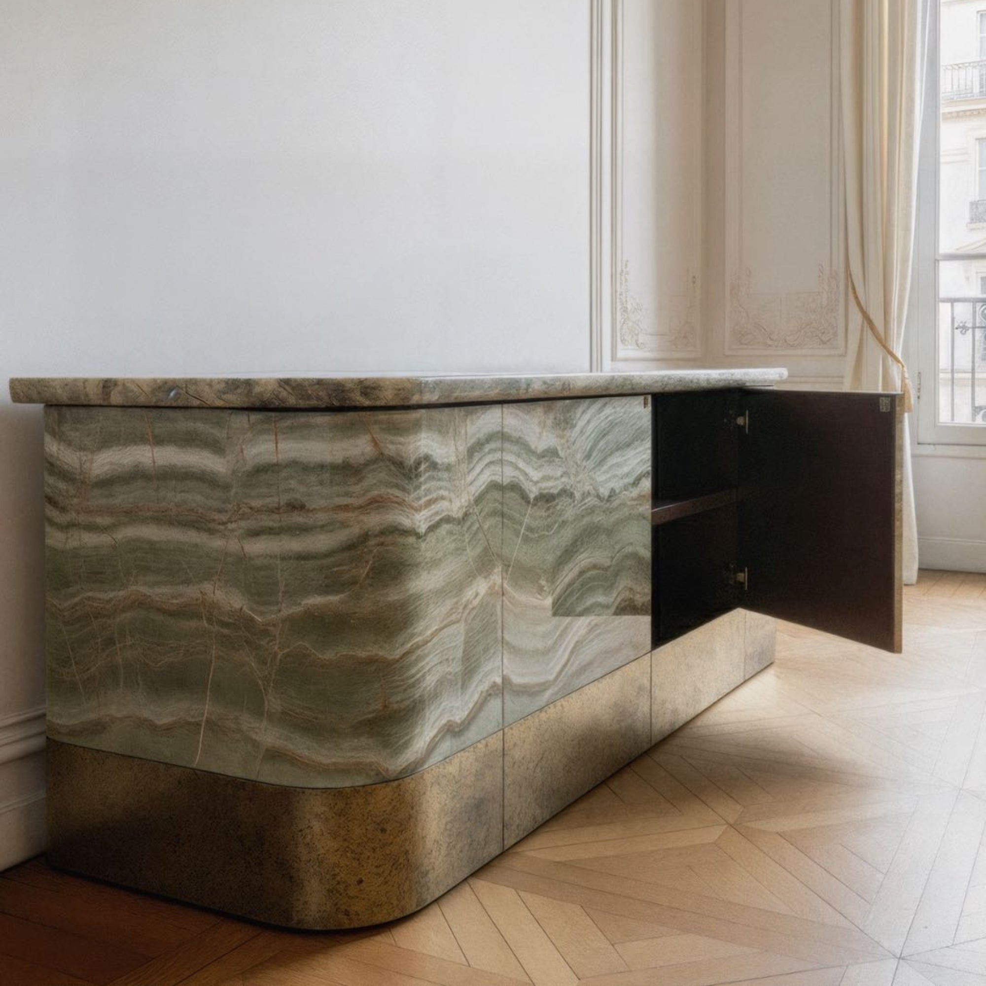 The Beaumont Console is crafted entirely from green onyx, showcasing sweeping striations and a monolithic design. Its sculptural form is complemented by a warm breccia base, creating a statement of both natural beauty and refined craftsmanship.