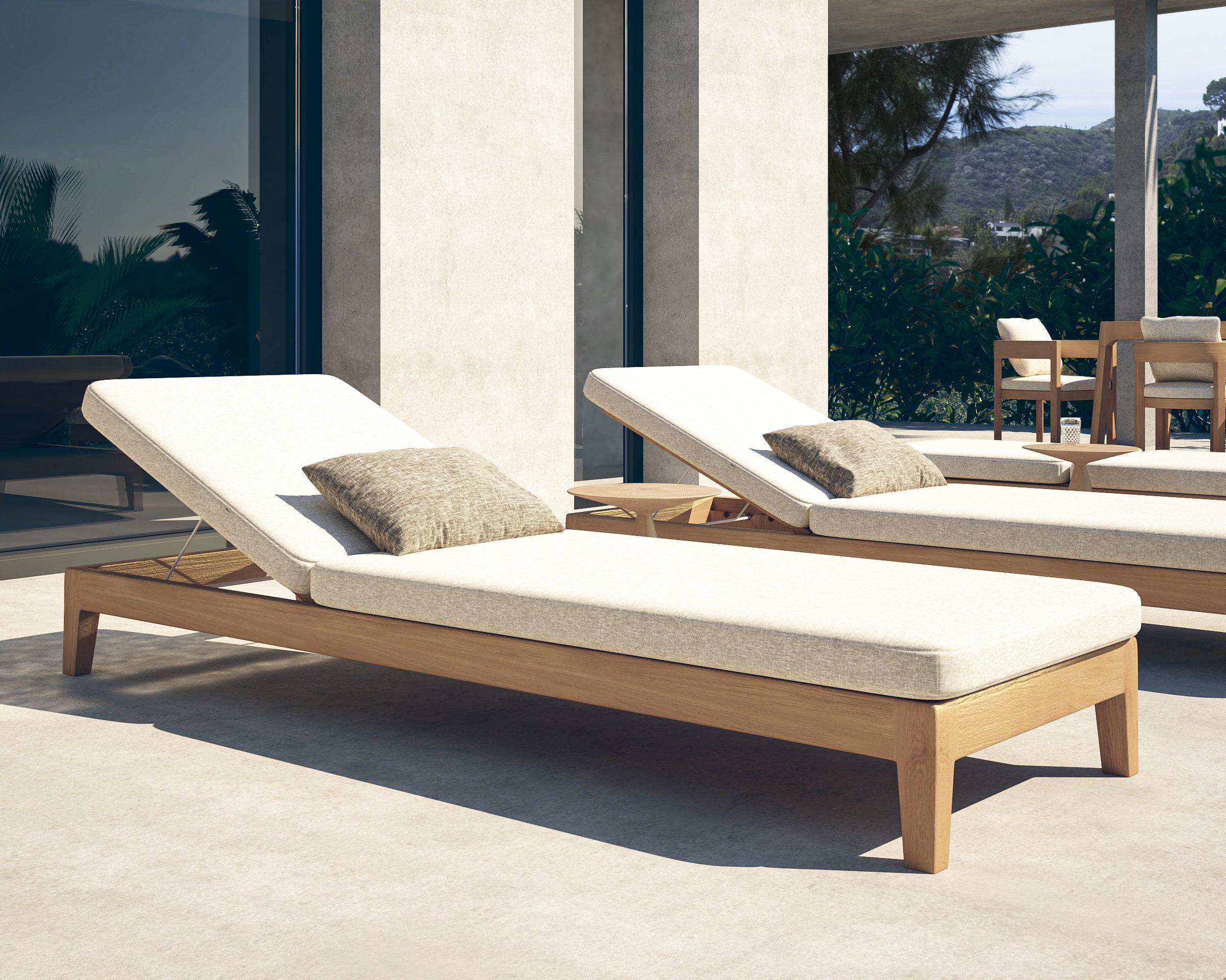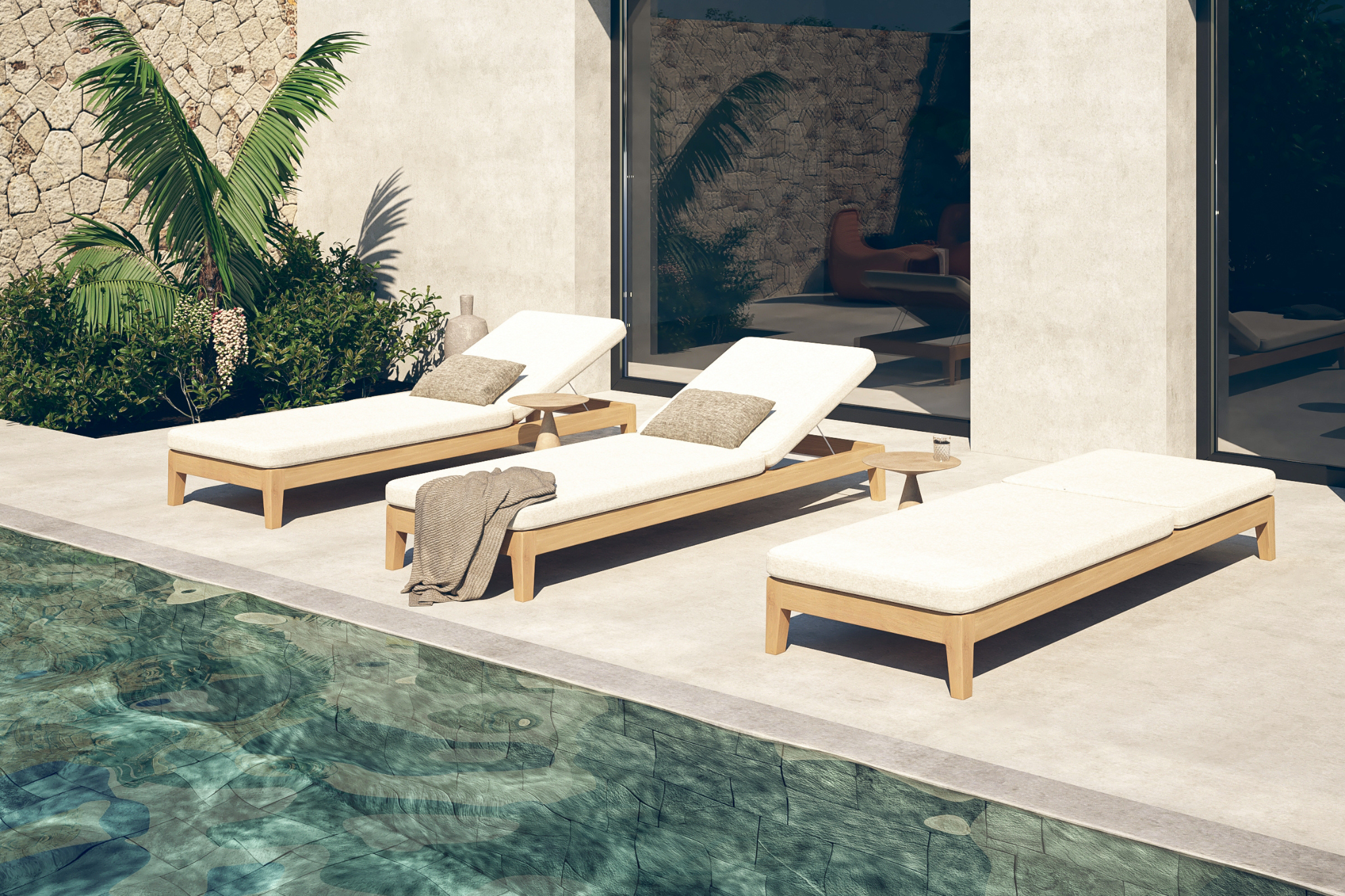 The Bourdain Patio Chaise Lounge blends luxurious design with unparalleled durability, featuring Grade A weathered teak and high-density, quick‑dry foam cushions, complemented by sleek metal accents for modern outdoor elegance.
