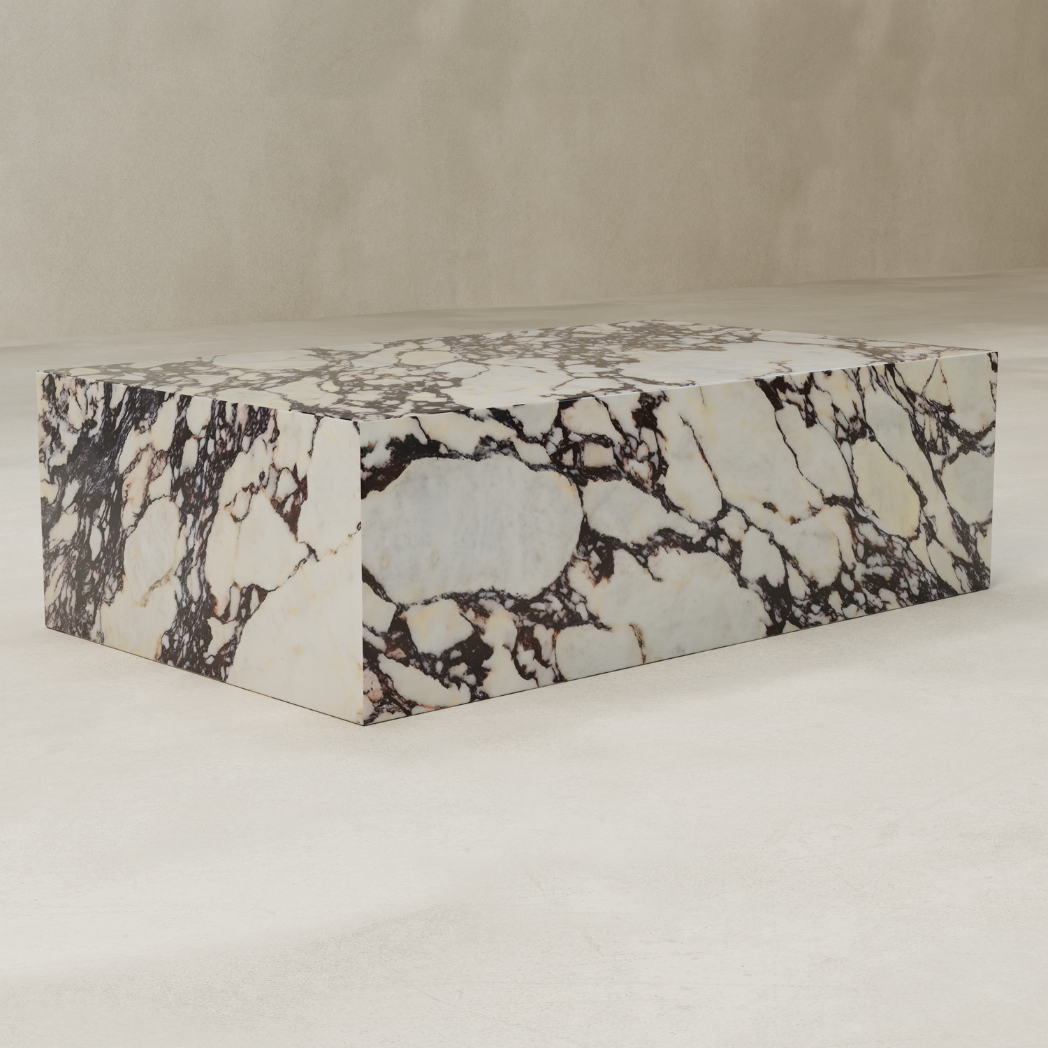 The Calacatte Marble Plinth is a statement in contrast — warm cream tones set against a bold, natural surface.