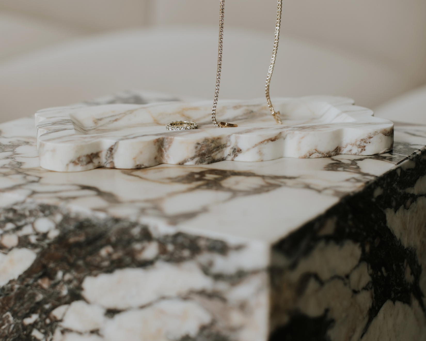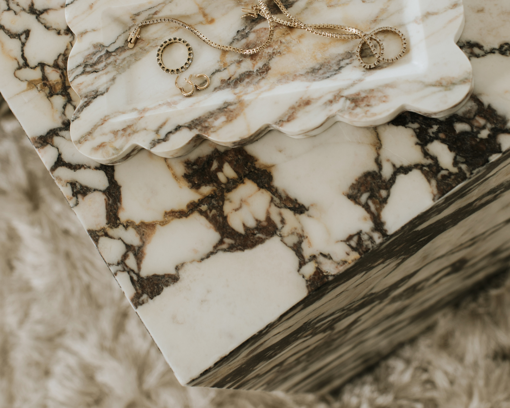 The Calacatte Marble Plinth is a statement in contrast — warm cream tones set against a bold, natural surface.