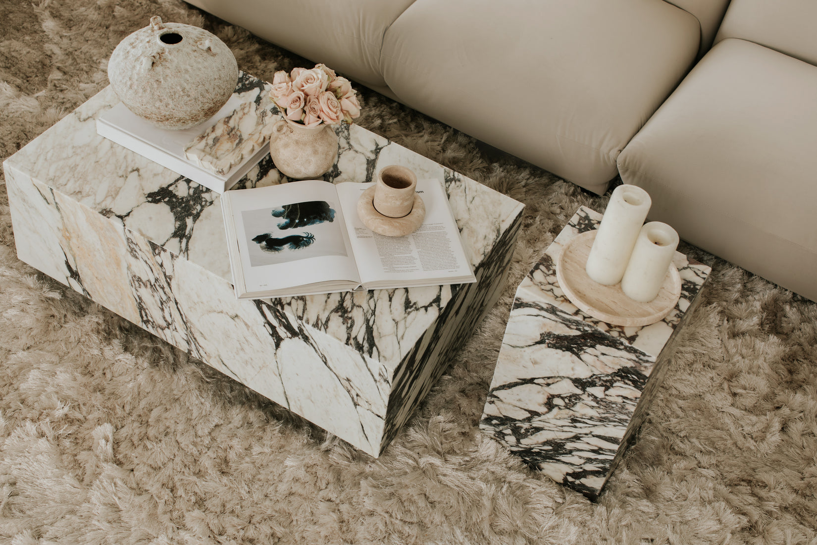 The Calacatte Marble Plinth is a statement in contrast — warm cream tones set against a bold, natural surface.