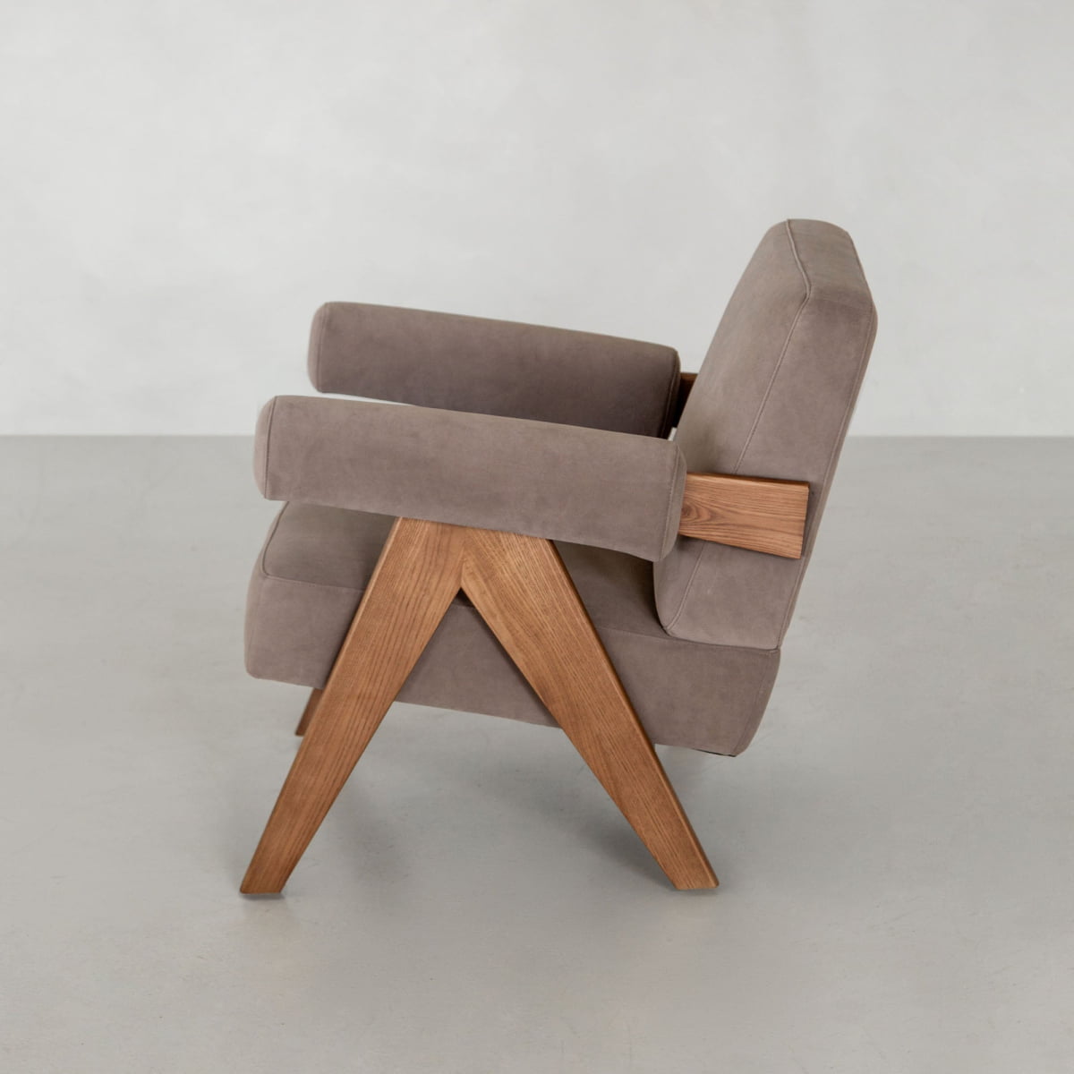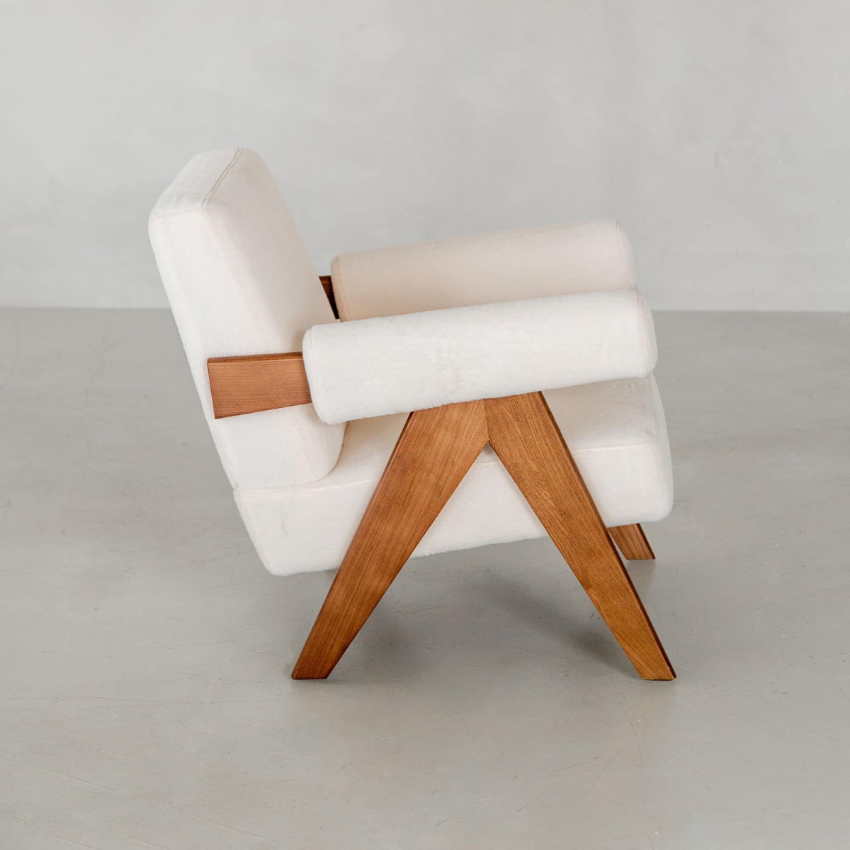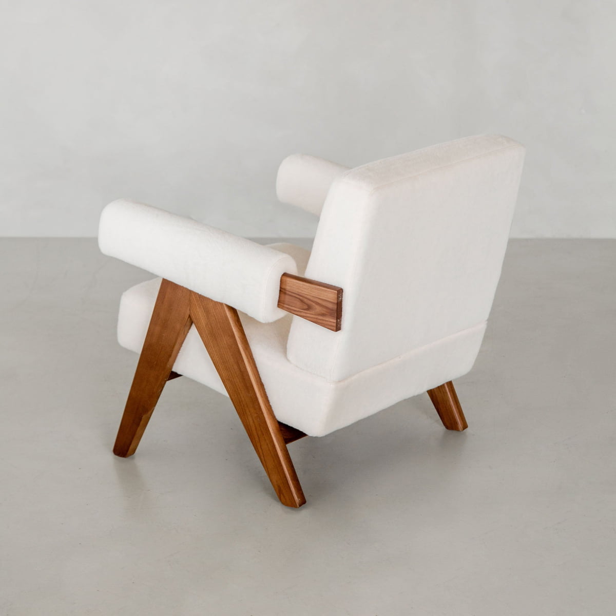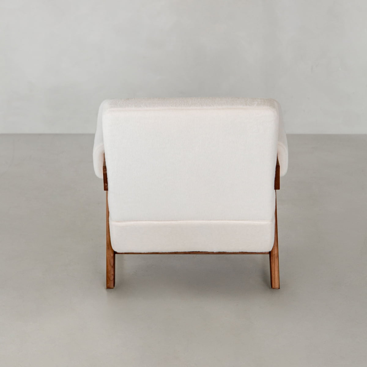 Crafted with a solid ash wood frame, known for its distinct grain and durable structure. The seat, back, and armrests are upholstered in vegan cowhide mohair—made from 100% polyester with a soft, subtly textured finish that mimics the look of natural hide and the gentle sheen of mohair.