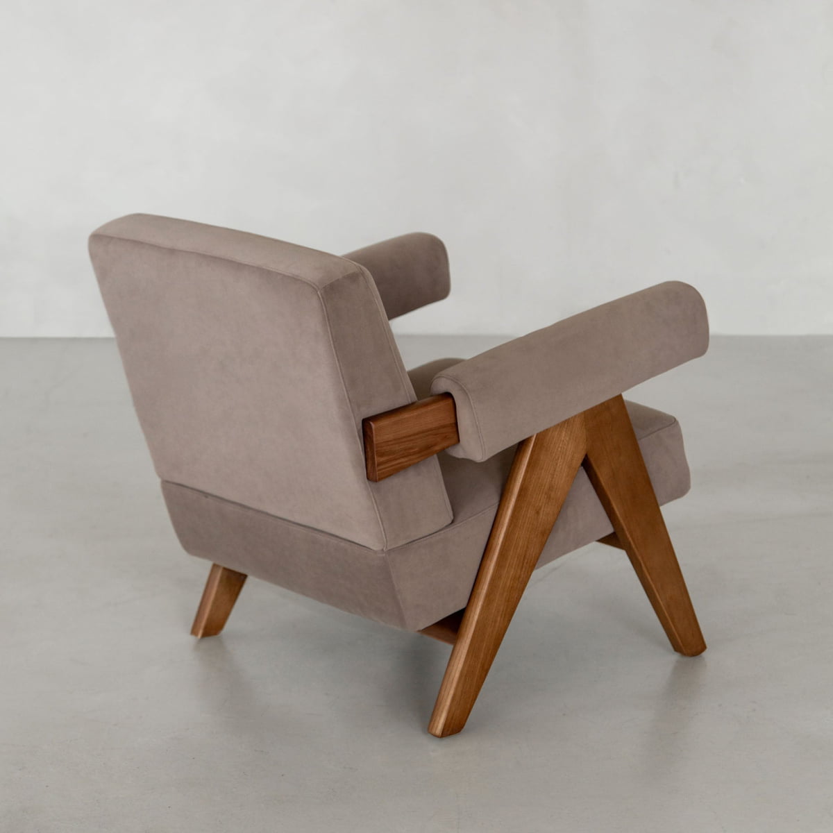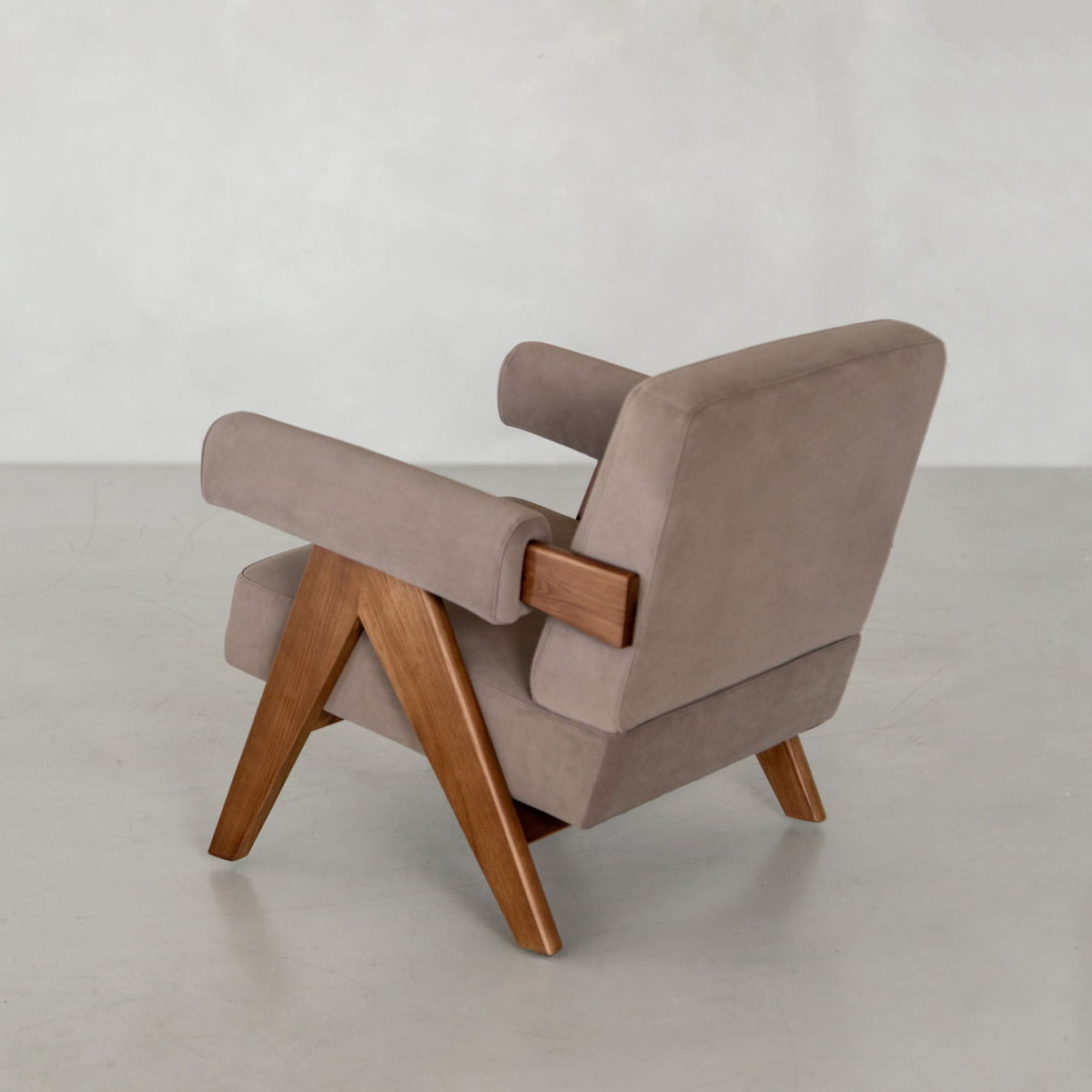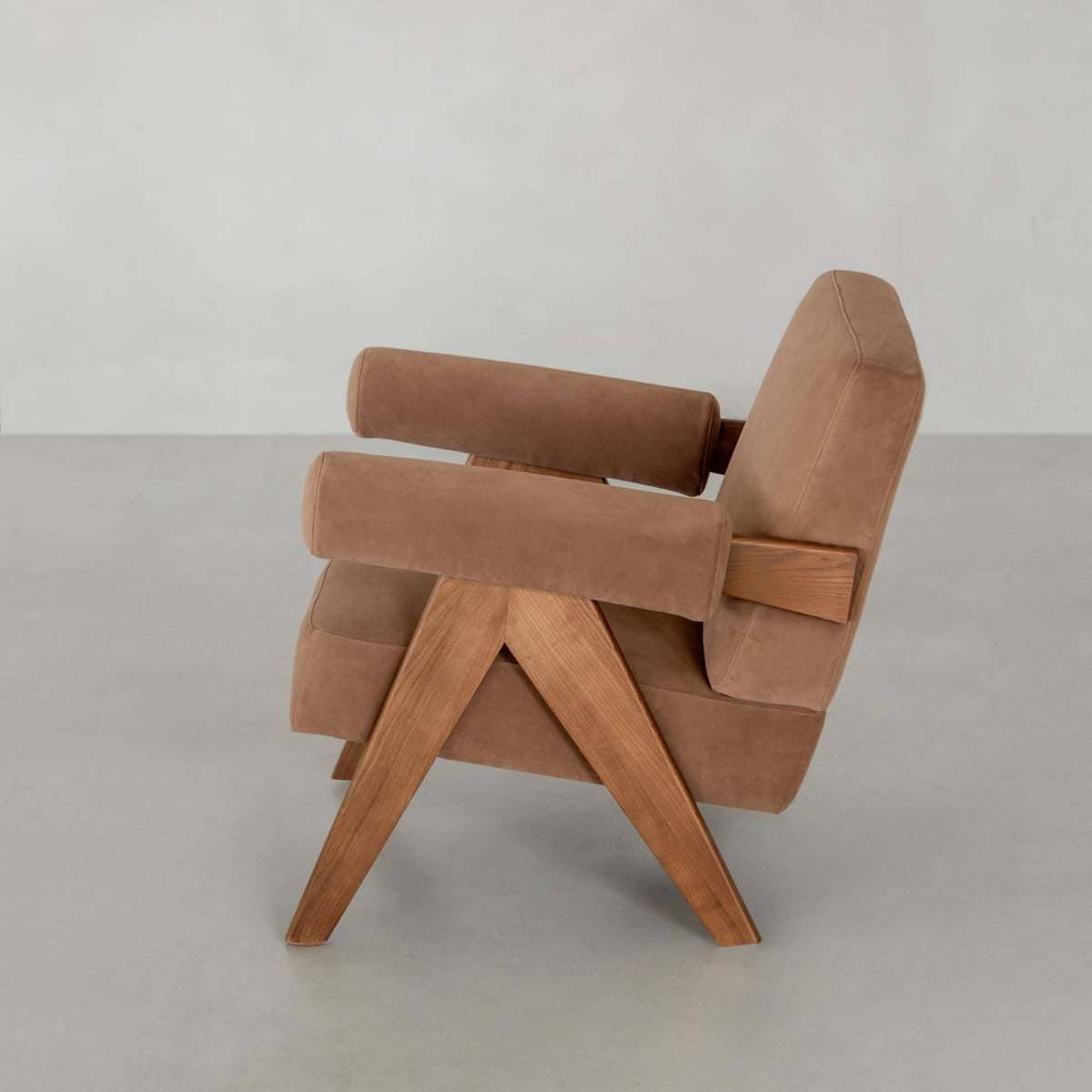 Crafted with a solid ash wood frame, known for its distinct grain and durable structure. The seat, back, and armrests are upholstered in vegan cowhide mohair—made from 100% polyester with a soft, subtly textured finish that mimics the look of natural hide and the gentle sheen of mohair.