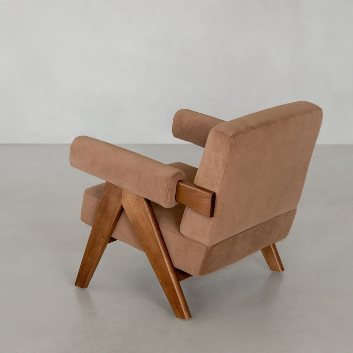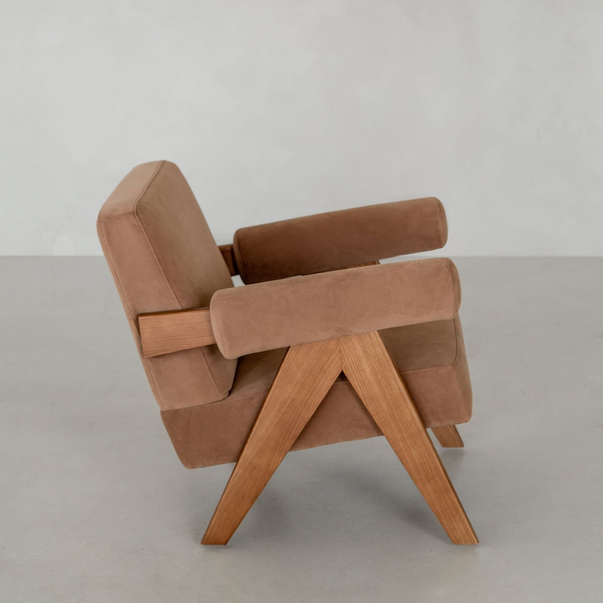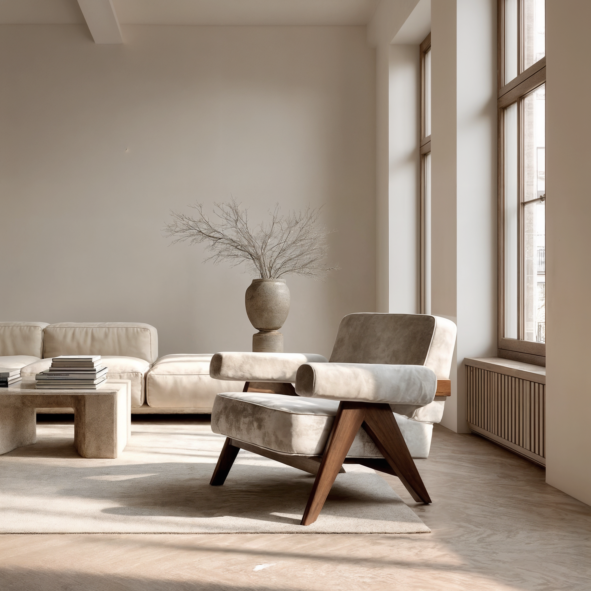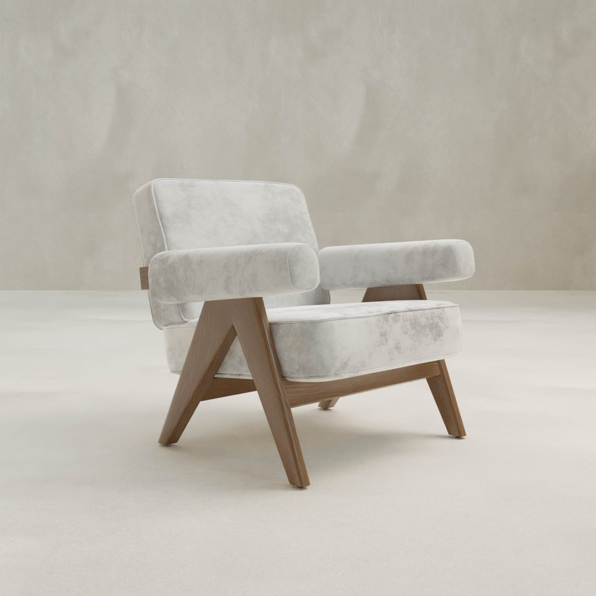 Crafted with a solid ash wood frame, known for its distinct grain and durable structure. The seat, back, and armrests are upholstered in vegan cowhide mohair—made from 100% polyester with a soft, subtly textured finish that mimics the look of natural hide and the gentle sheen of mohair.