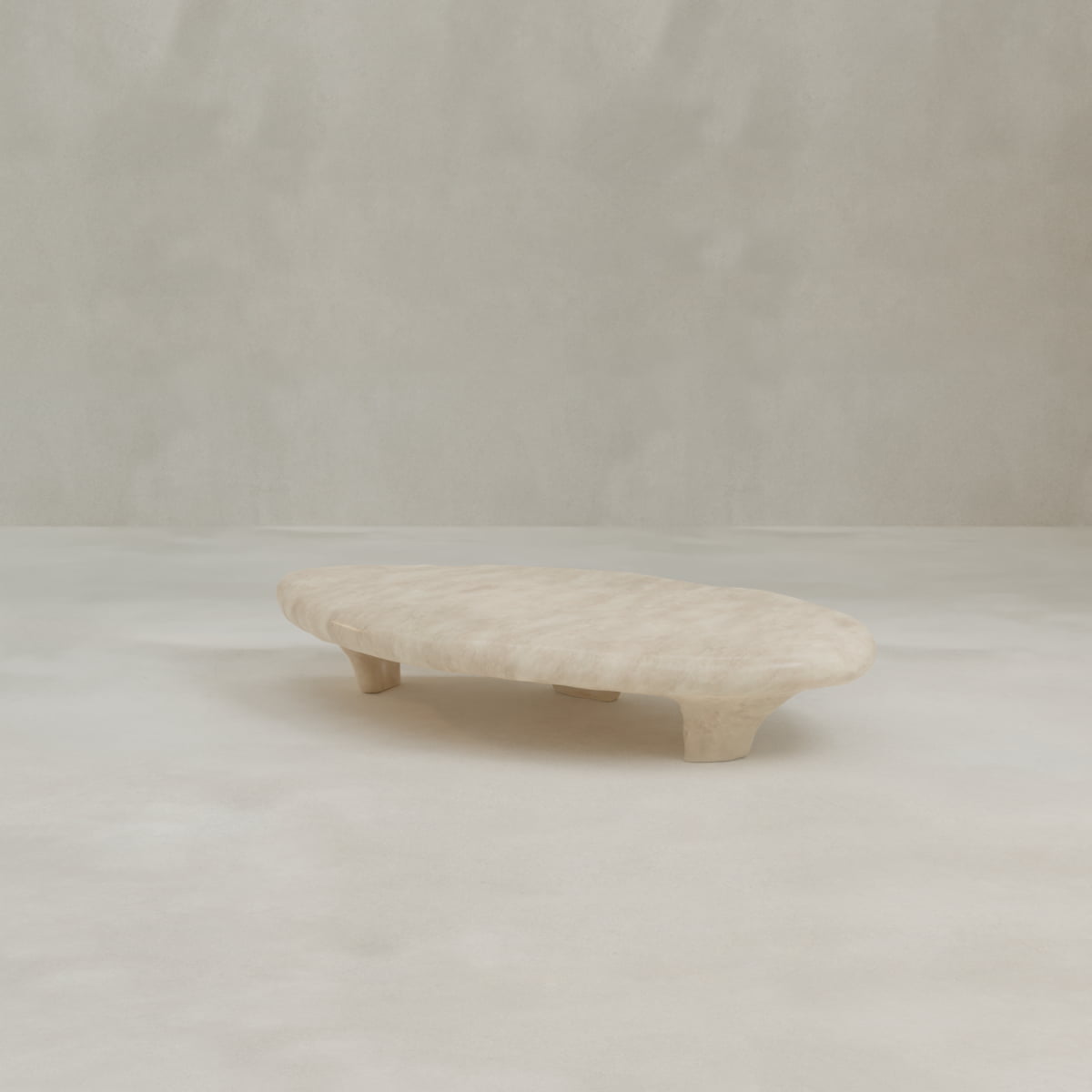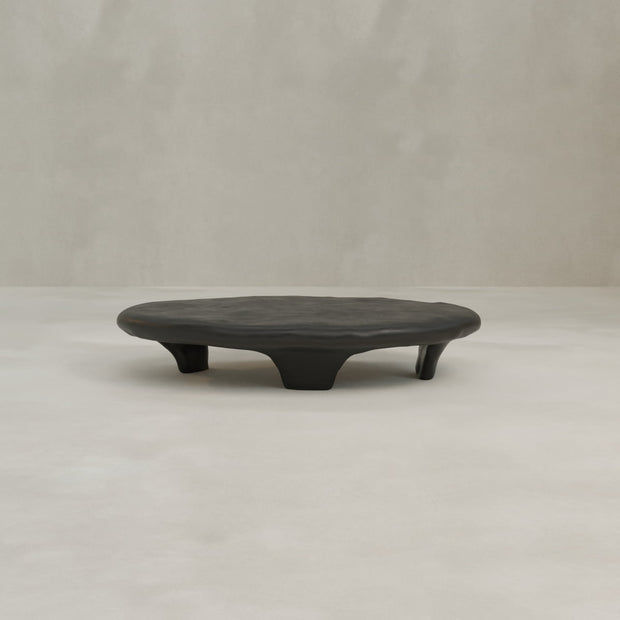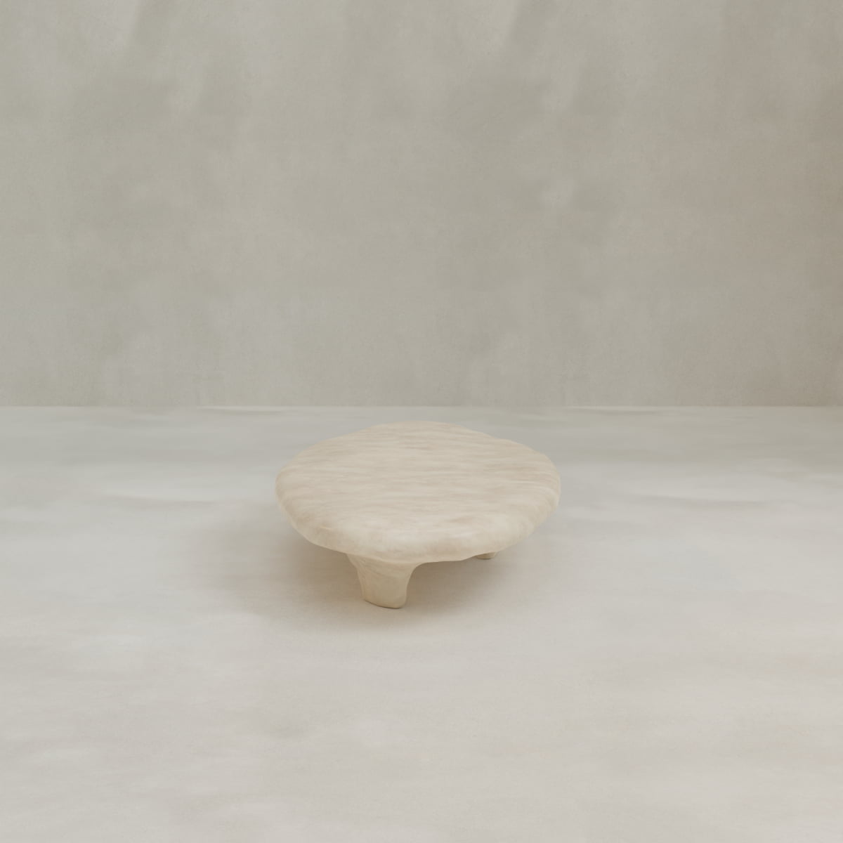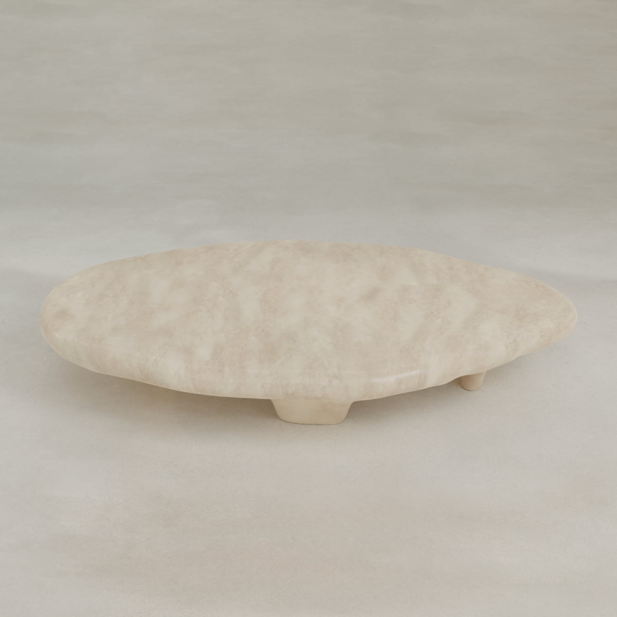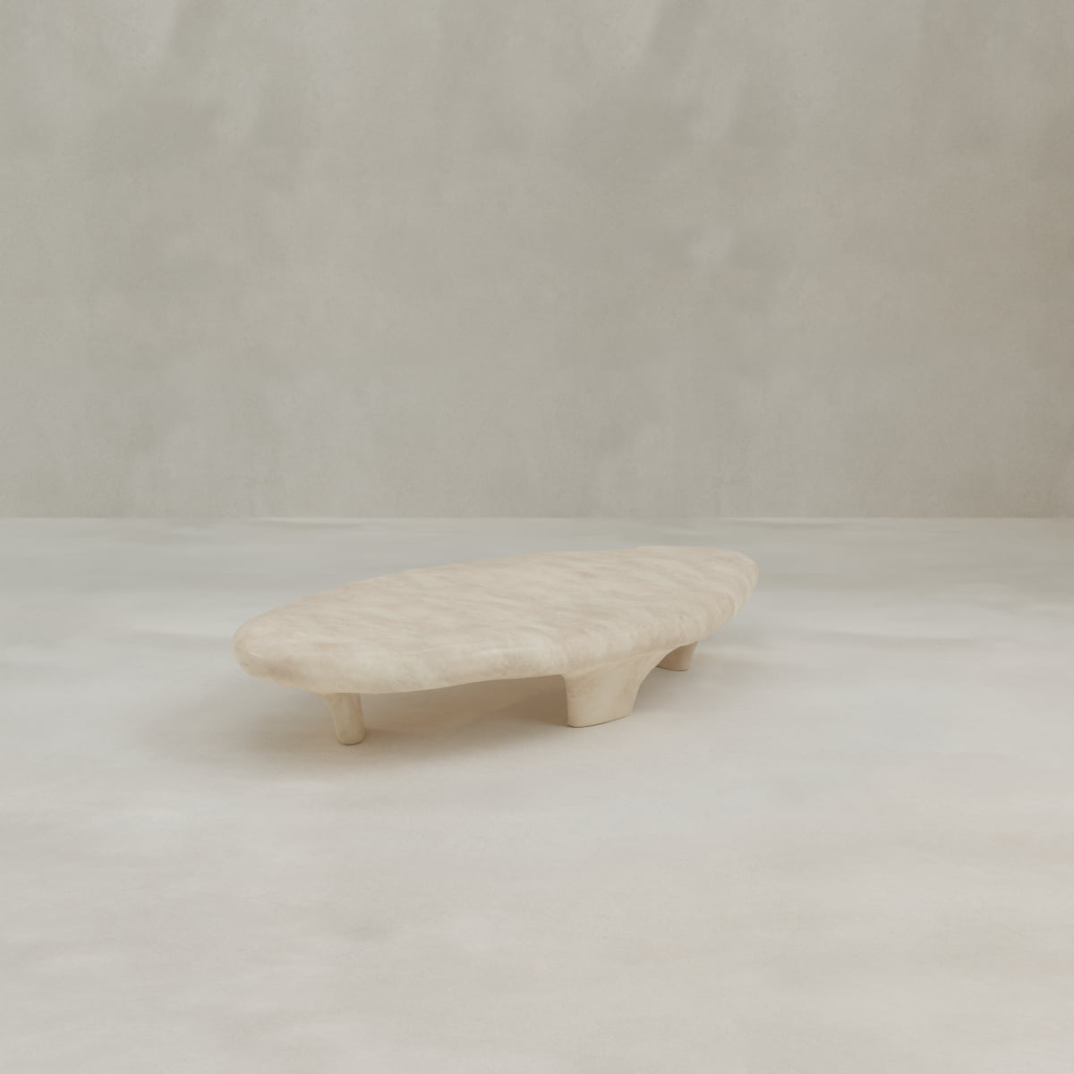 The Cleo Coffee Table features a sculptural, low-profile oval design crafted from cement-fiber with an antique-aged, hand-painted finish that brings vintage artistry and durability into modern spaces.