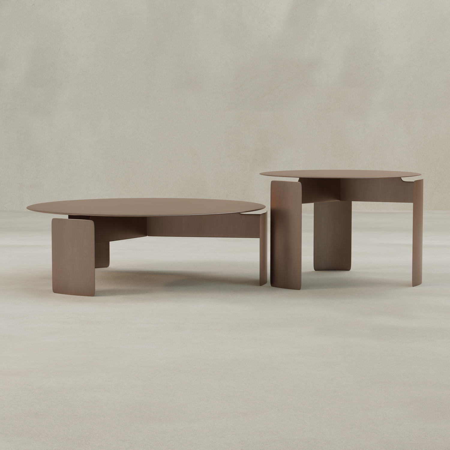 The Cortene Tables are crafted from durable iron with a refined matte finish, offering a sculptural design that combines strength and elegance. Their bold, geometric shape and subtle textures make them a striking addition to any space.