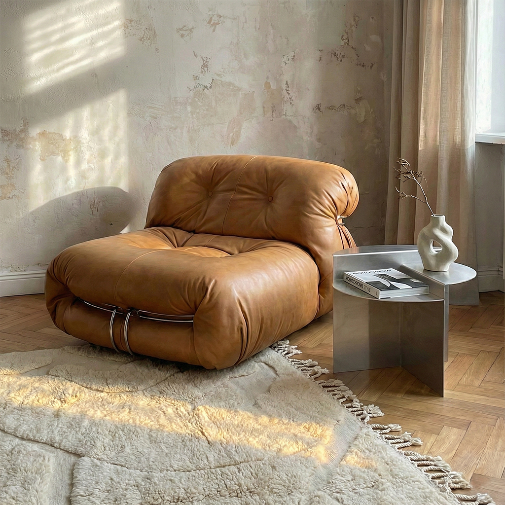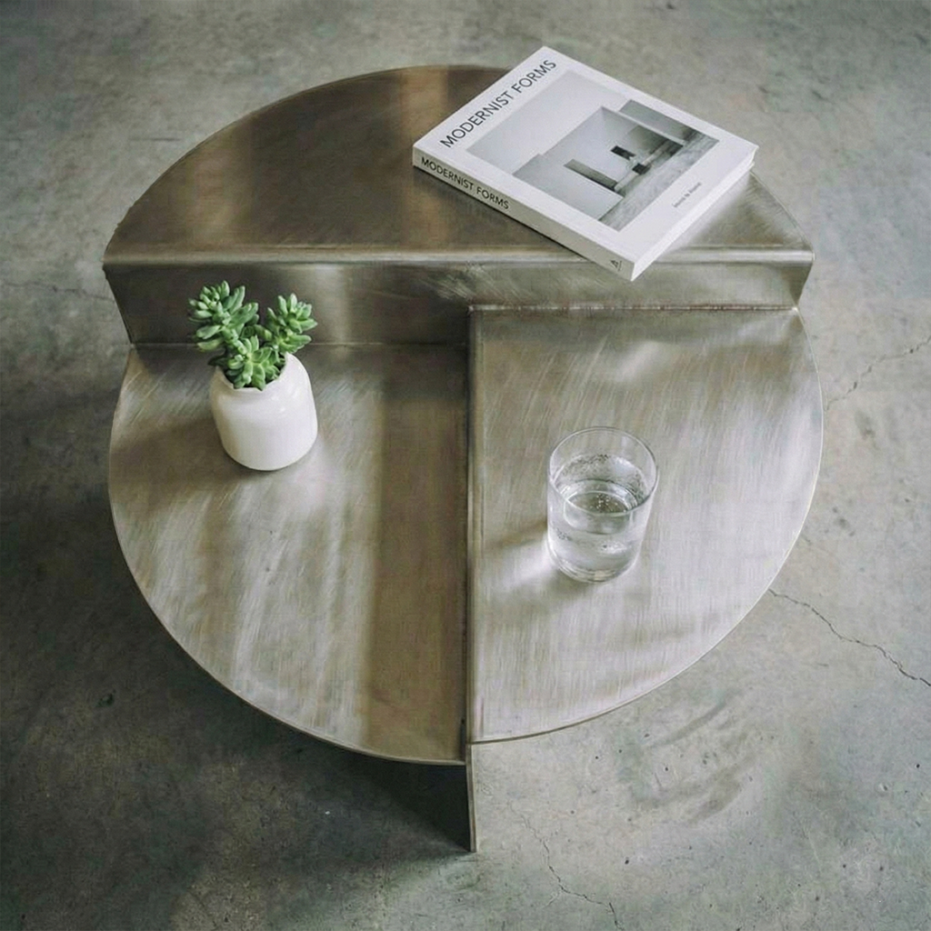 The Crucible Table features a split-circle silhouette formed from brushed steel, balancing soft geometry with architectural precision. Its stepped surface and matte finish create a sculptural presence that feels minimal, grounded, and deliberate.