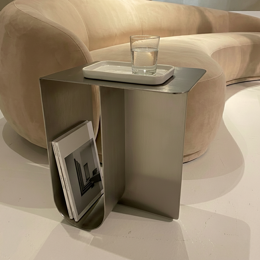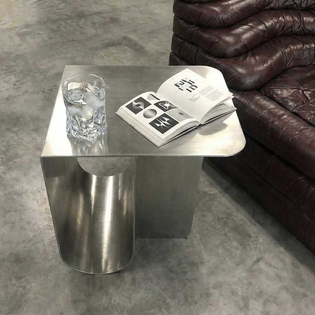 The Draxon Table is shaped from a single, continuous bend of brushed stainless steel, creating a seamless form that feels both engineered and sculptural. Its quiet strength lies in restraint—one gesture, softened edges, and a monolithic presence that shifts subtly with the light.