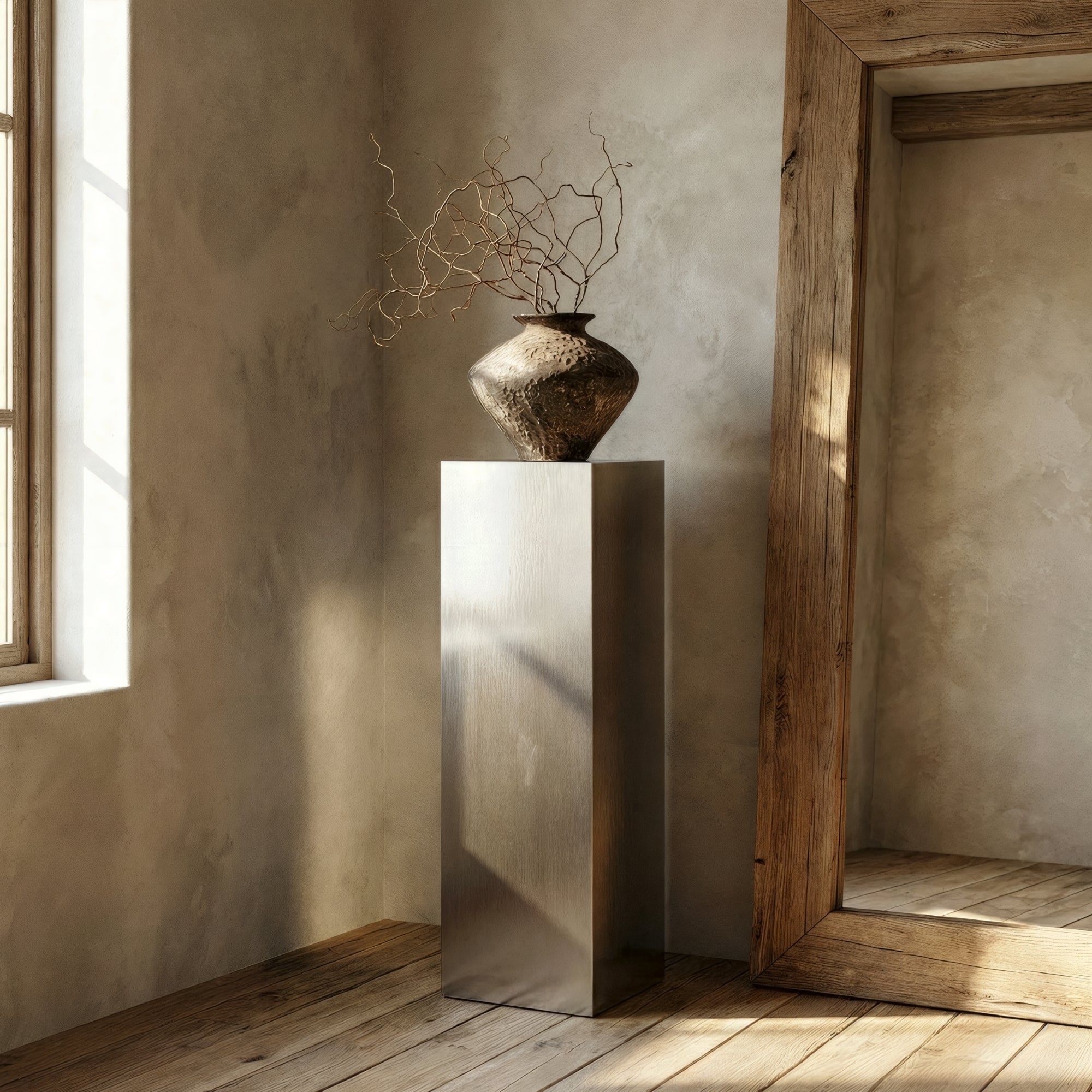 The Forge Steel Plinths are minimal steel volumes with clean lines and a brushed finish—built to anchor objects or stand alone. Offered in four formats, they shift easily between display, support, and statement.