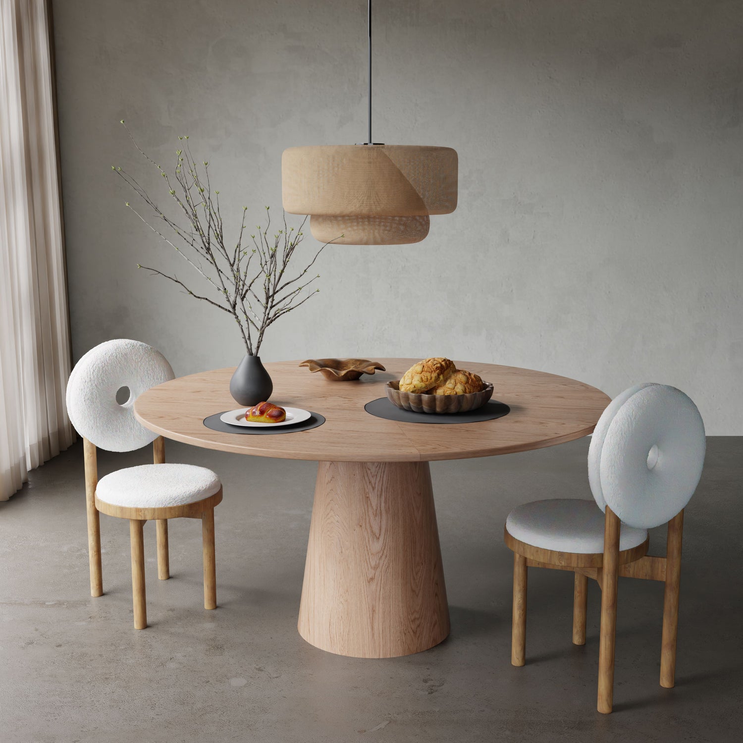 The Harlow + 2 Donut dining set should be cleaned regularly to maintain its finish and appearance. Wipe the wooden surfaces with a soft, dry cloth and use a wood-safe oil or polish occasionally to prevent drying. For the Donut chairs, vacuum the boucle fabric with a soft brush attachment or use a gentle fabric cleaner, and dust the wood regularly. Avoid direct sunlight, moisture, and harsh chemicals to preserve both the wood and upholstery.