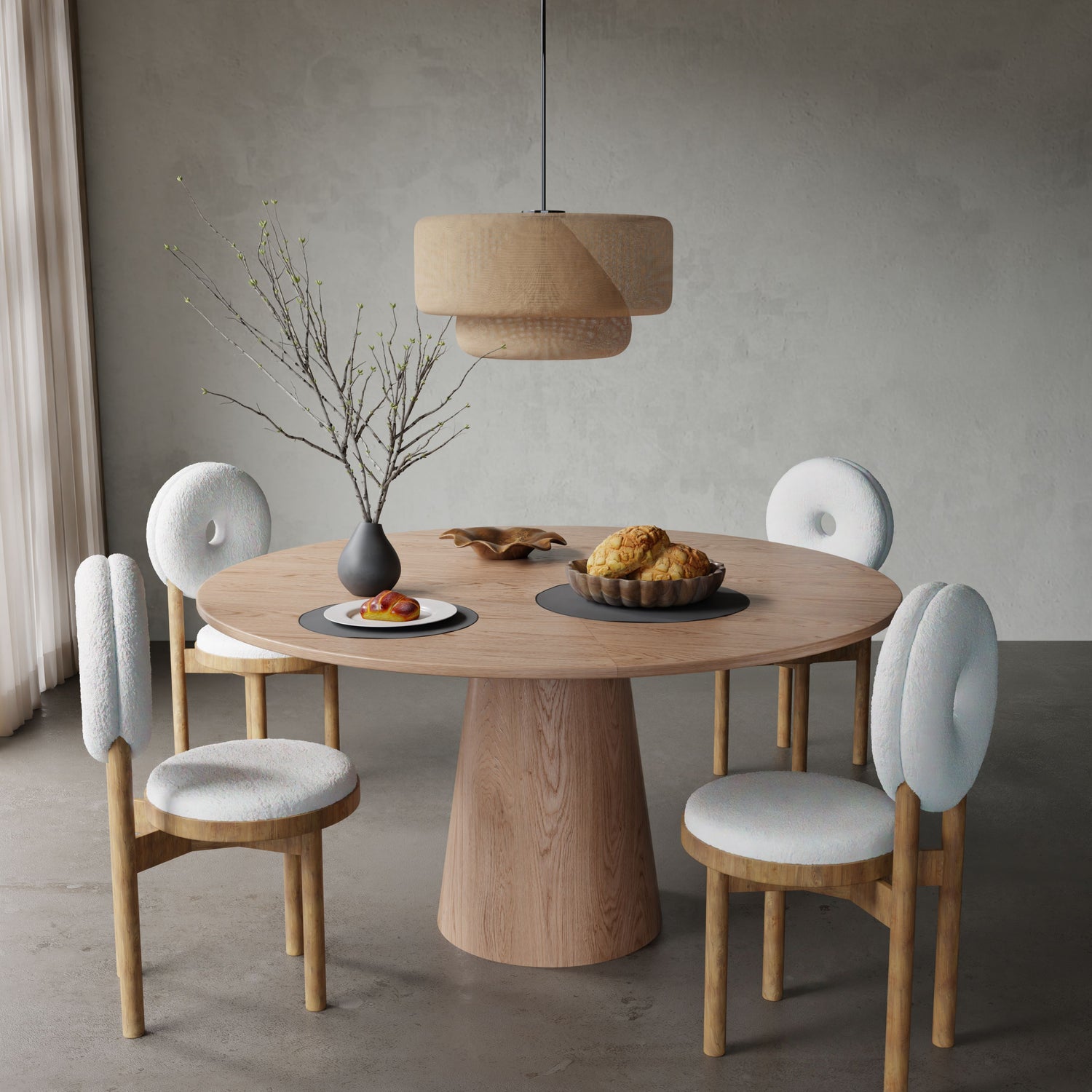 The Harlow + Donut dining set should be cleaned regularly to maintain its finish and appearance. Wipe the wooden surfaces with a soft, dry cloth and use a wood-safe oil or polish occasionally to prevent drying. For the Donut chairs, vacuum the boucle fabric with a soft brush attachment or use a gentle fabric cleaner, and dust the wood regularly. Avoid direct sunlight, moisture, and harsh chemicals to preserve both the wood and upholstery.