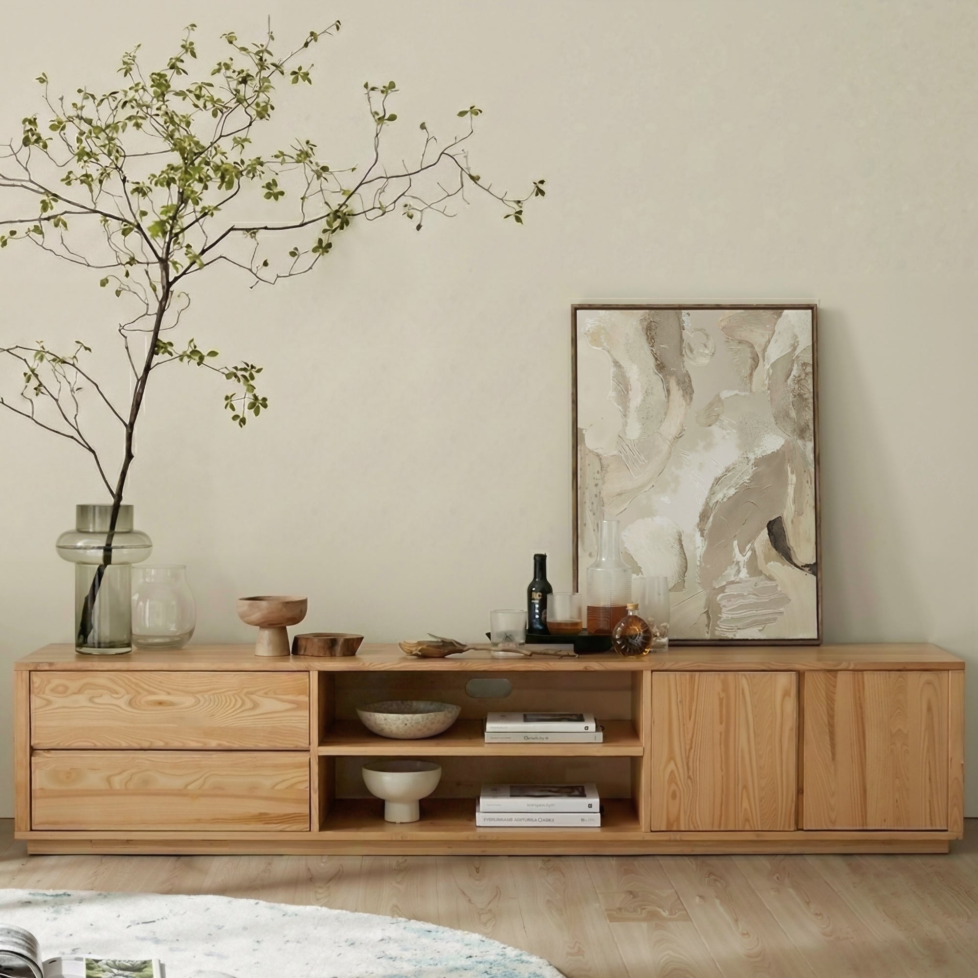 The Indre Media Console combines sleek modern design with smart storage—featuring two soft-close drawers, two doors, and open shelves—all crafted in premium ash wood with a clean, minimalist aesthetic.