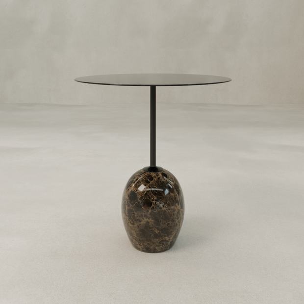 The Le Folie Table mrges luxury and sculptural form with a premium Crema Italian marble base and sleek powder-coated steel stem topped with a minimalist surface—perfect for modern interiors.