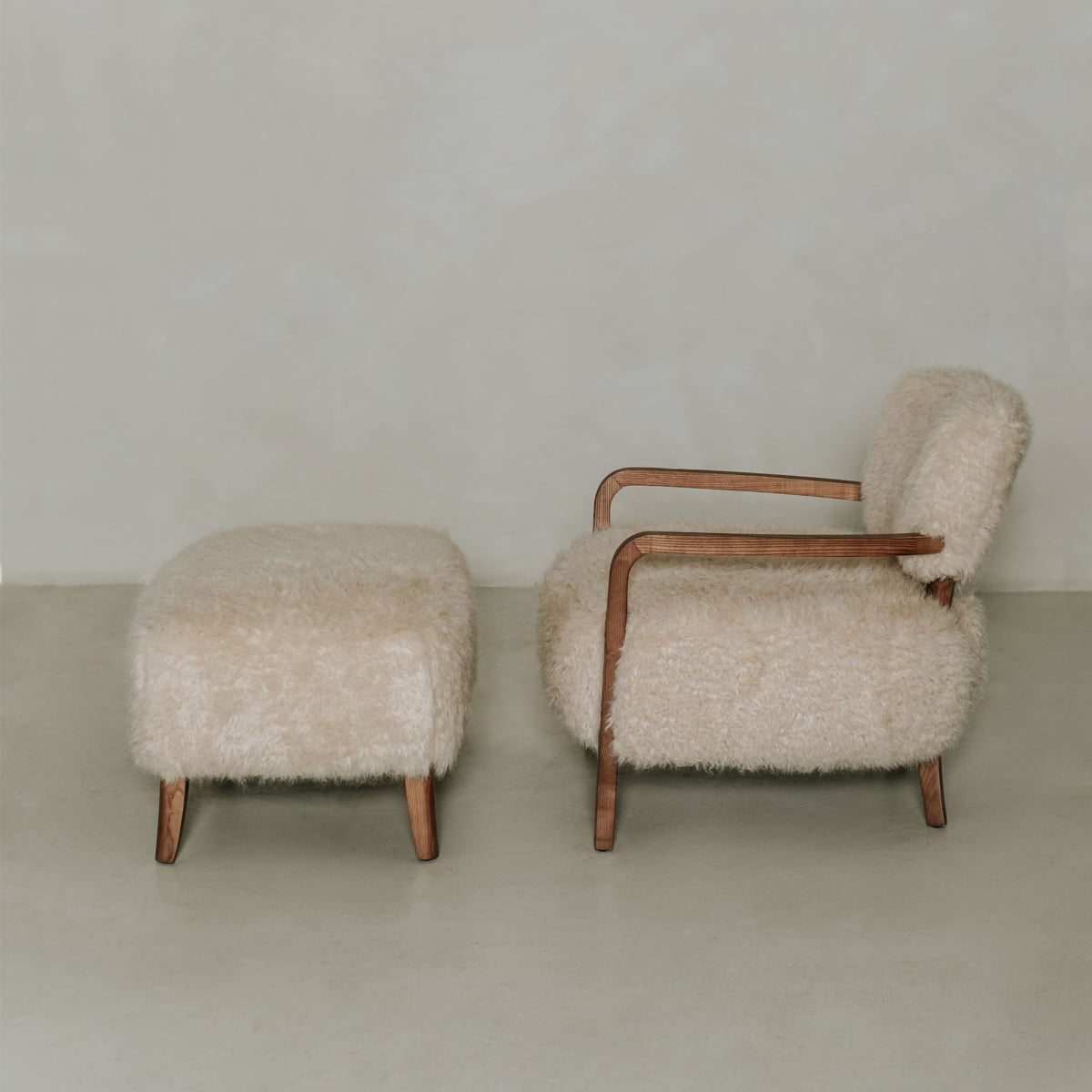 The Malmo Chair combines luxurious comfort with minimalist style—plush vegan shearling upholstery drapes over a sculptural fiberglass shell and solid ash wood arms and legs, creating a warm, tactile statement piece.