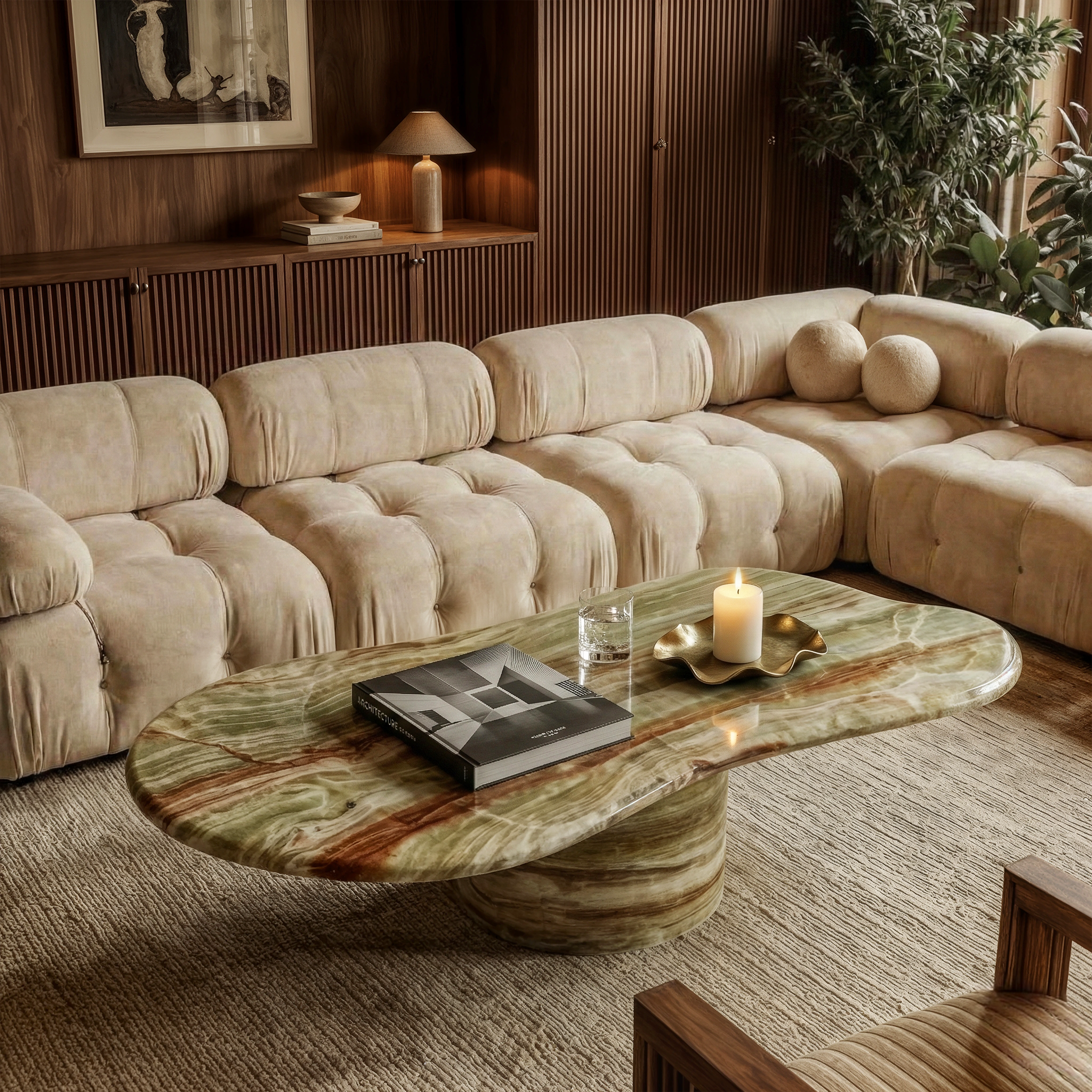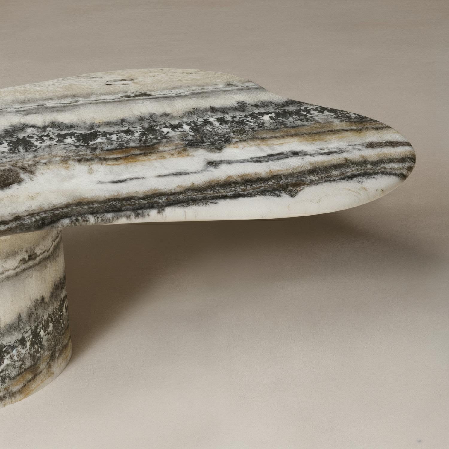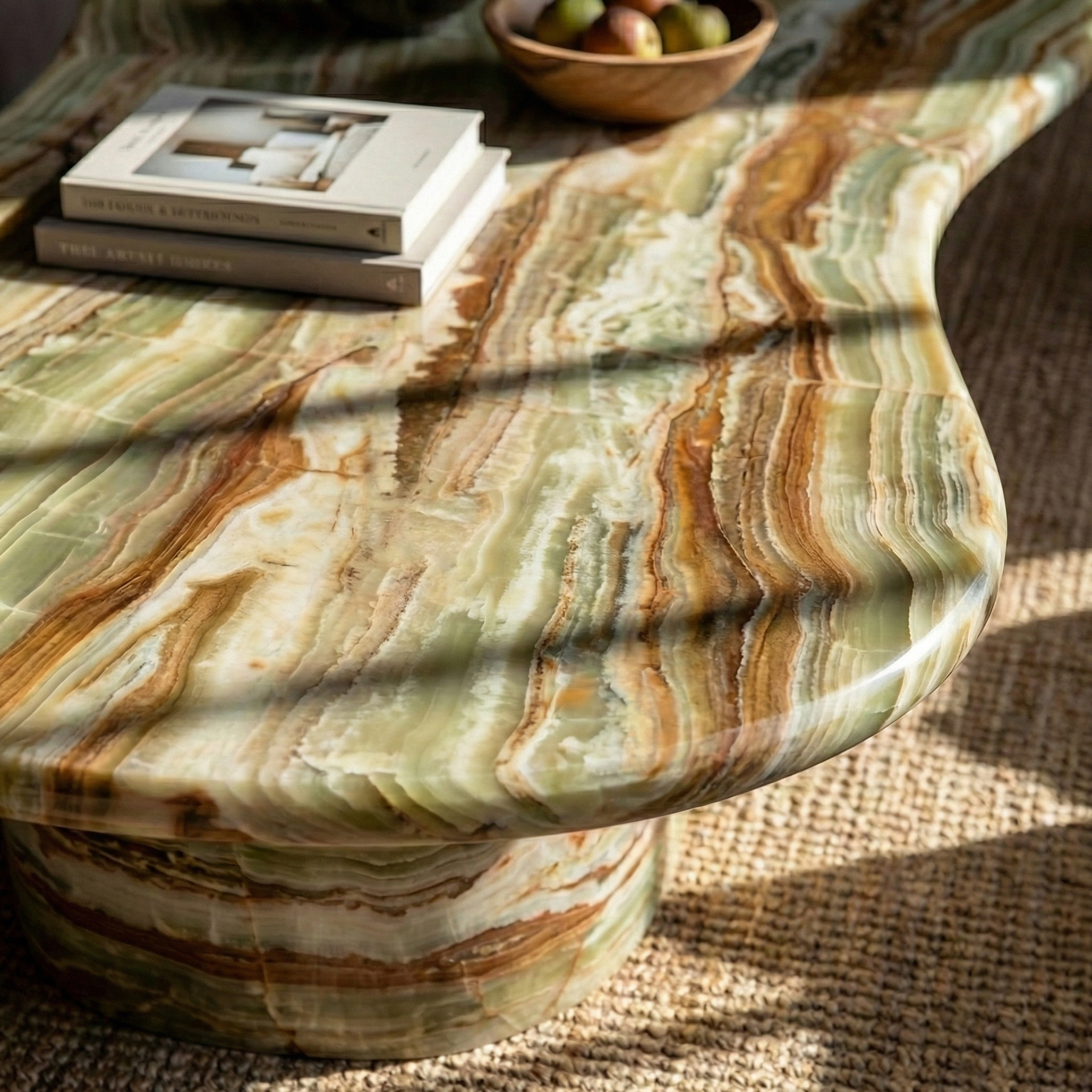 The Opaline Onyx Coffee Table is a masterpiece of natural stone and wood, featuring layers of warm striations that ripple across the onyx surface. Its unique shape and handcrafted details make it a striking focal point in any living space, combining geological artistry with luxury design.