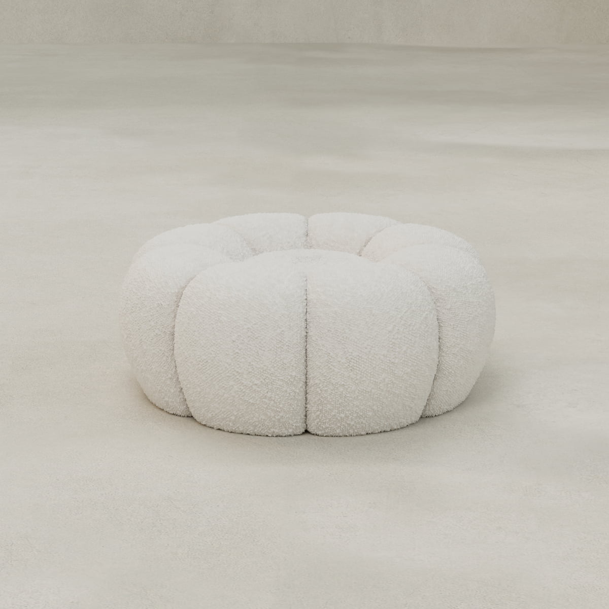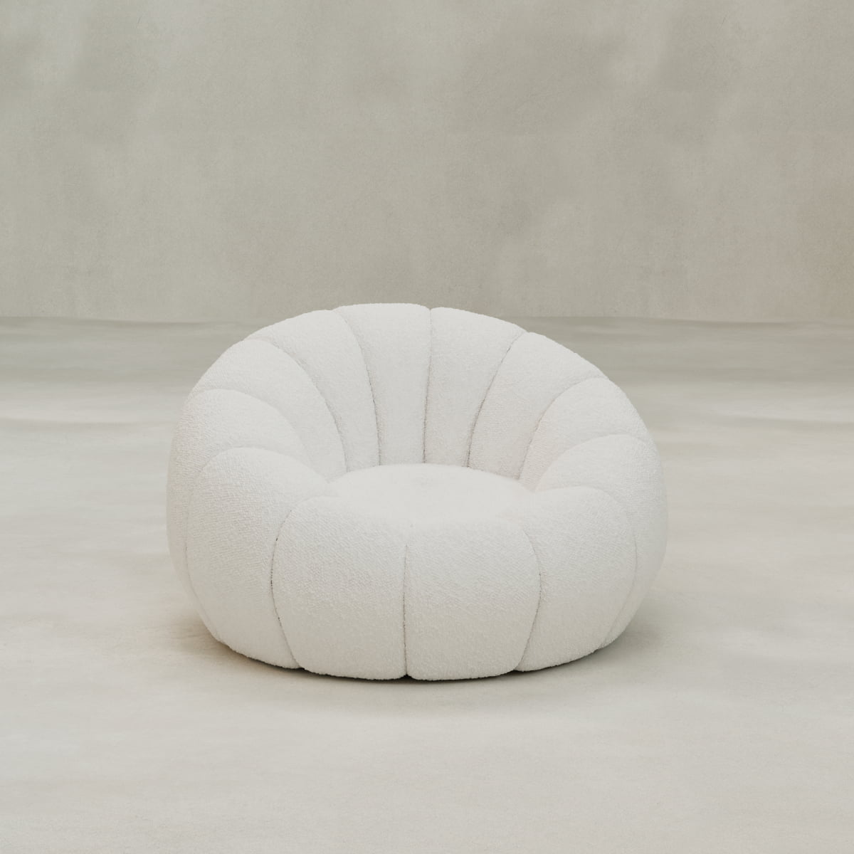 The Penelope Chair with Ottoman features a plush, oversized, scalloped bouclé design inspired by mid-century modern forms, with a smooth swivel base and thick high-density foam for luxurious comfort and sculptural presence.