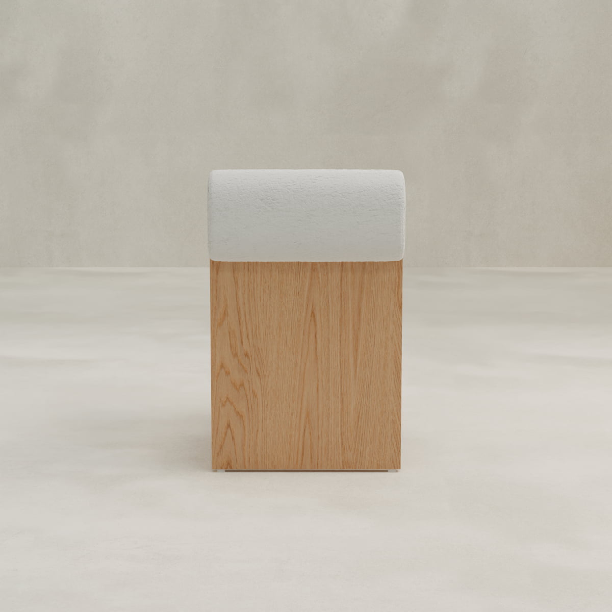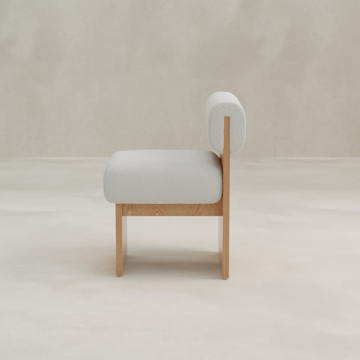 The Primrose Chair features clean, angular lines on a solid ash wood frame, paired with thick plush bouclé upholstery for luxurious comfort and minimalist sophistication.