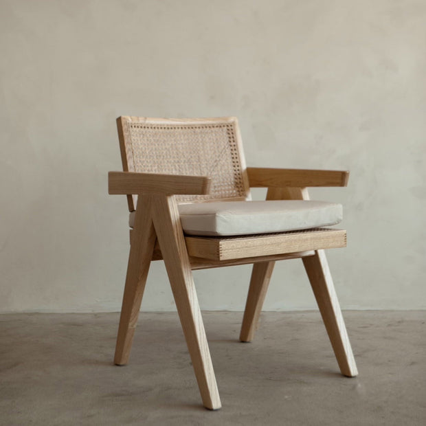 This piece features finely crafted ash wood, enhanced with a rich, polished finish that highlights its natural grain and strength. The cane detailing adds a touch of artisanal elegance, with its intricate weave offering both texture and refinement. Together, these materials create a luxurious balance of sophistication and timeless design.