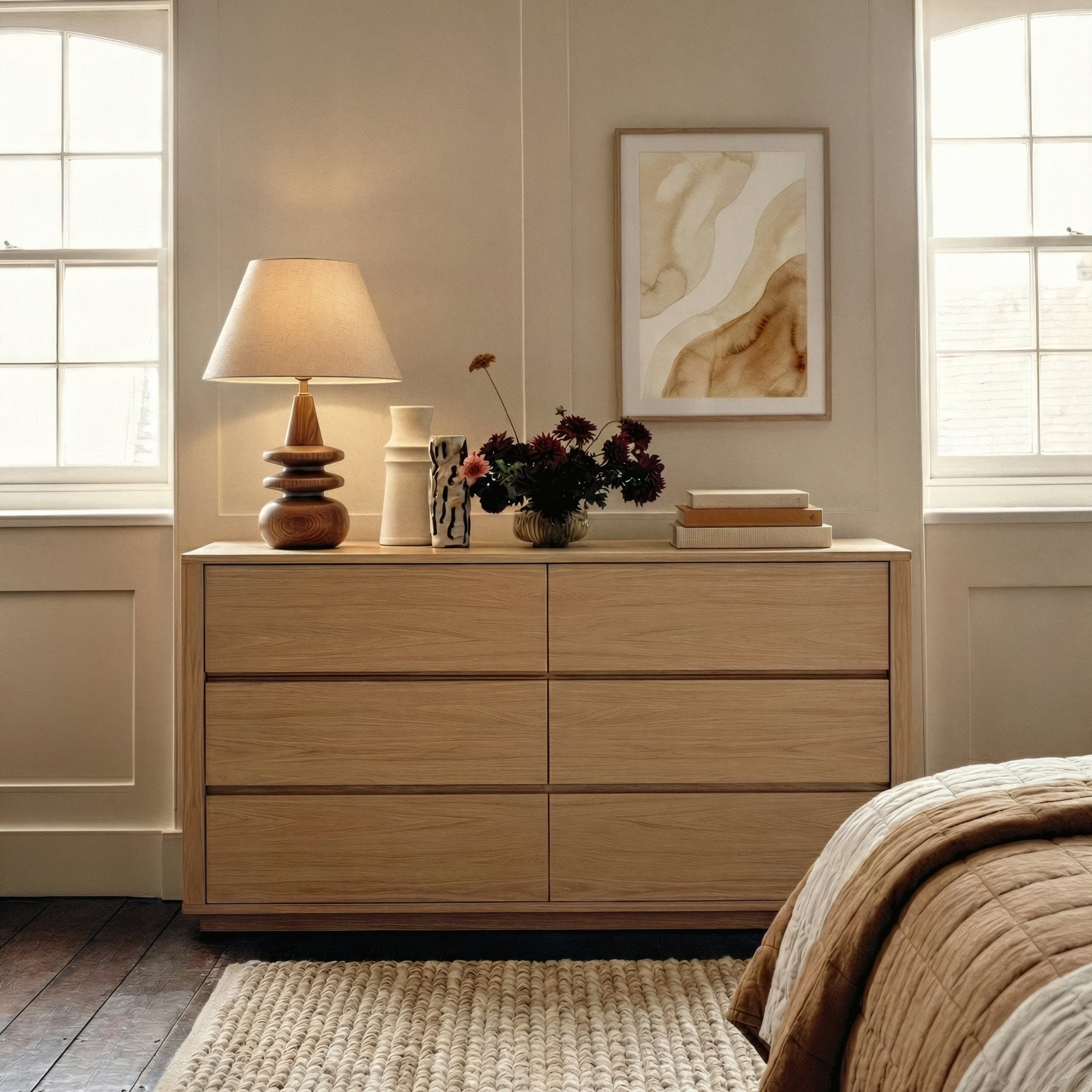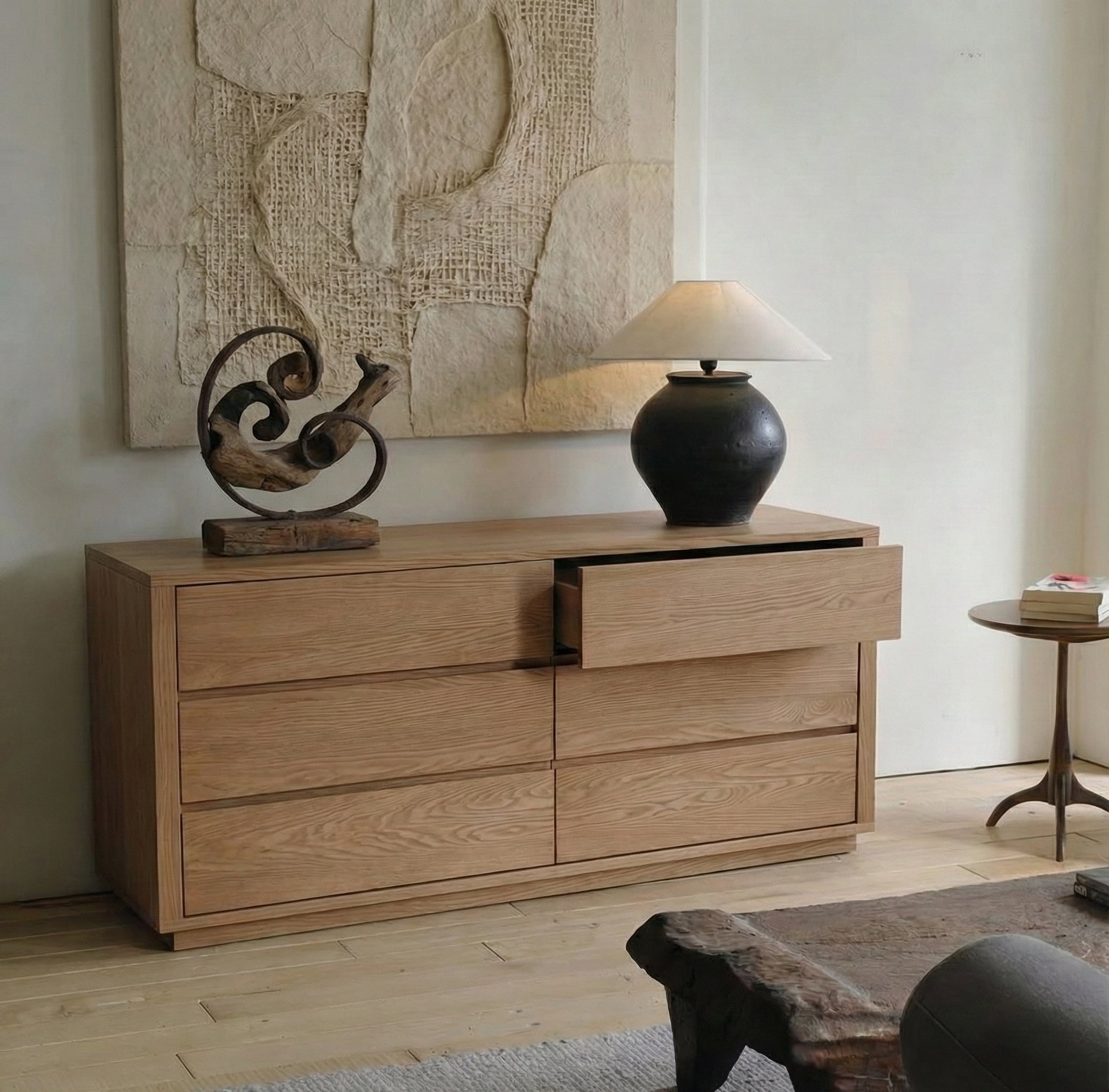 The Sandringham Dresser features six full-extension drawers within a clean, framed structure—built from solid wood with exposed joinery for tactile depth and refined utility.