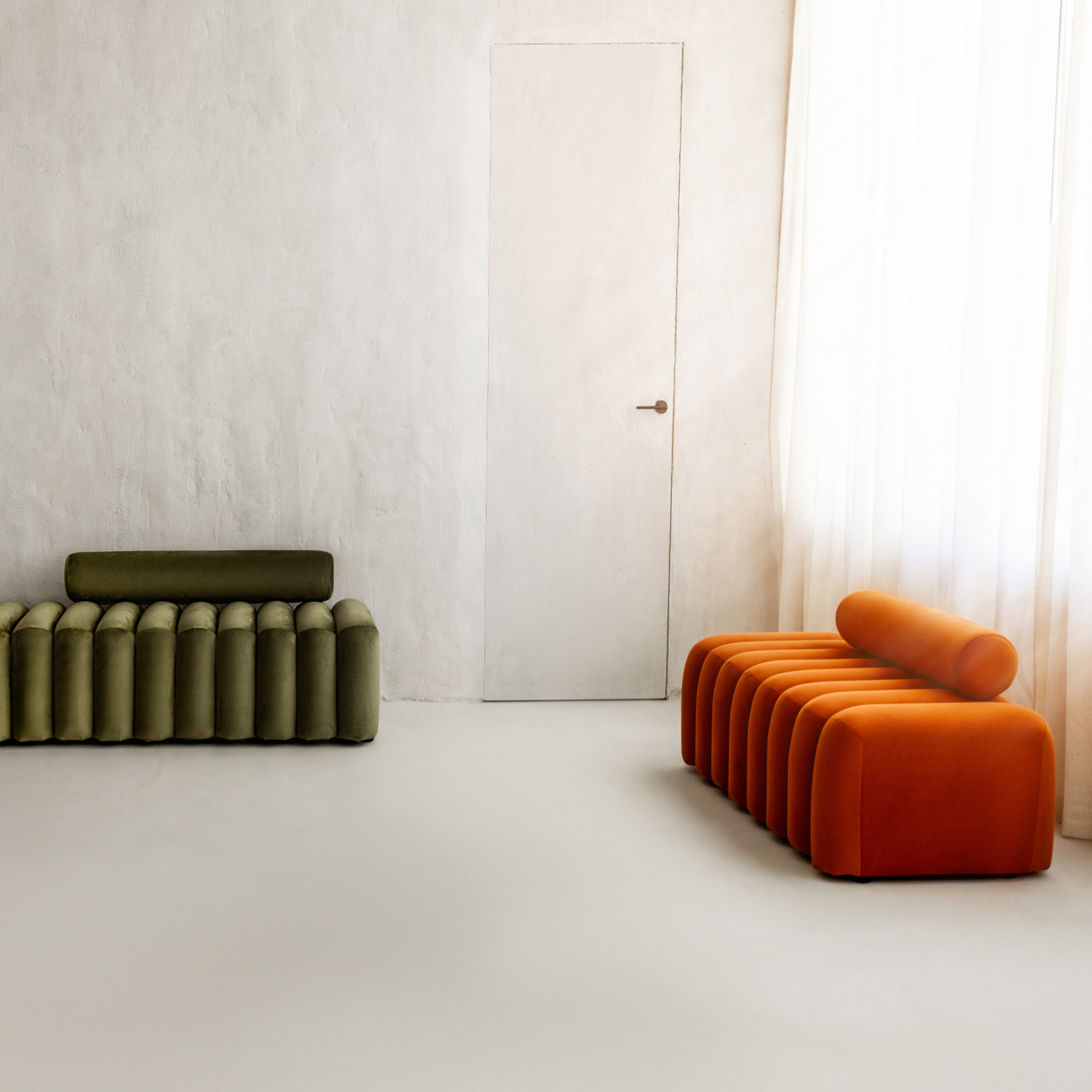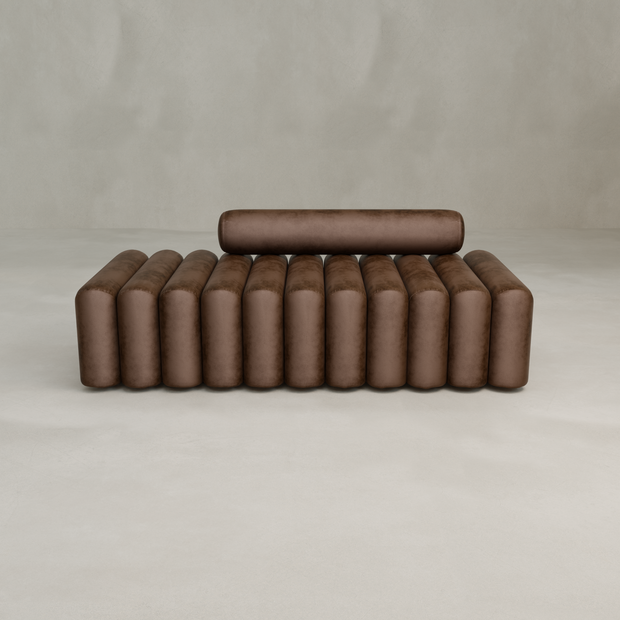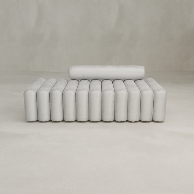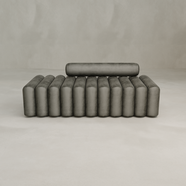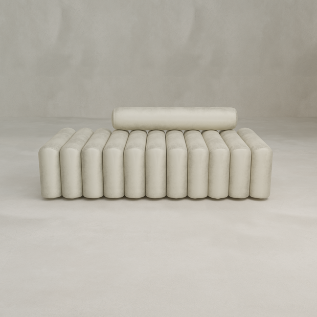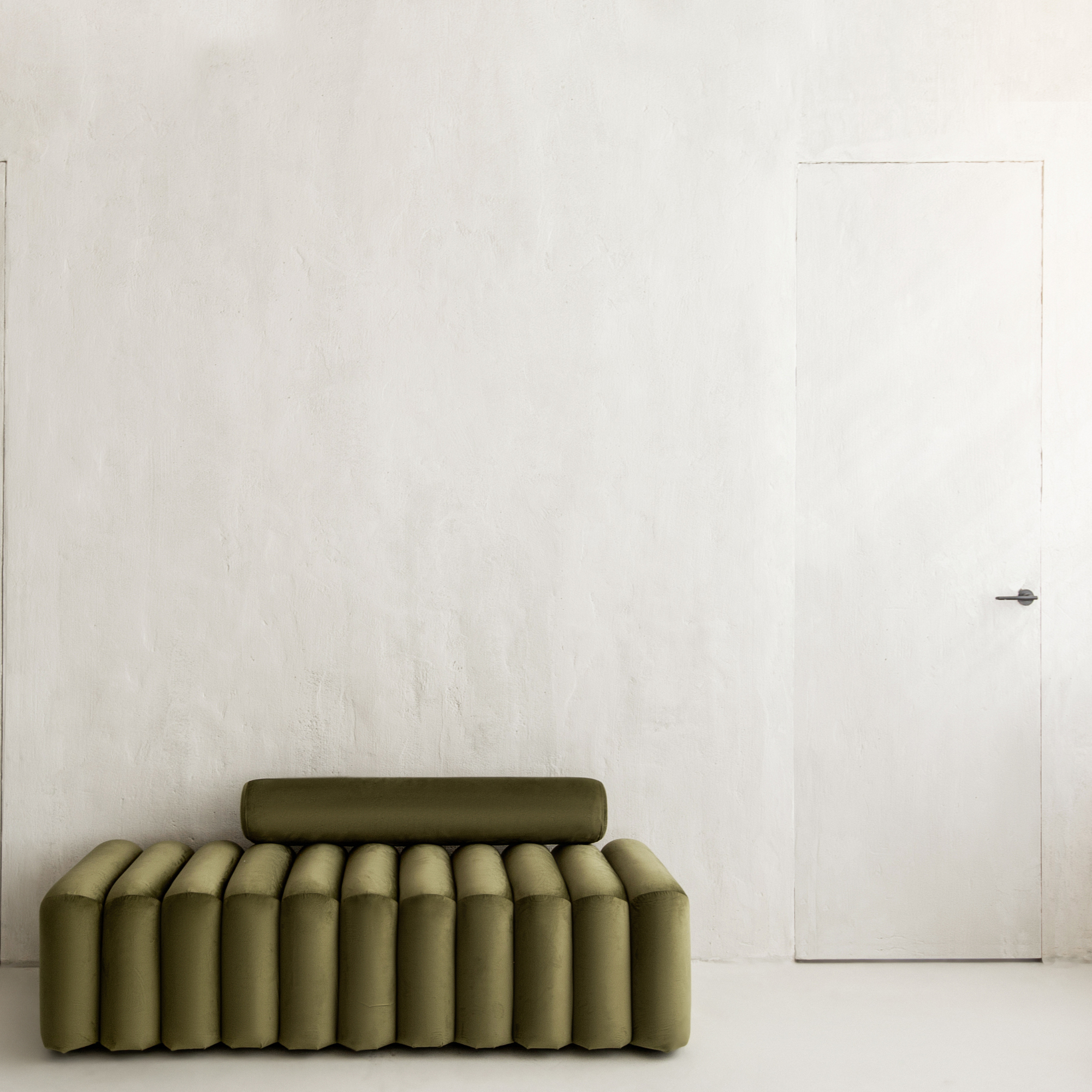 The Sonorra Bench is a modern marvel with quilted velvet upholstery and a cylindrical backrest, blending plush comfort with sculptural elegance—perfect for adding opulent style to any space.