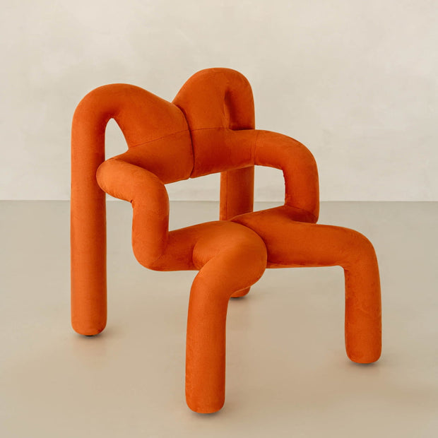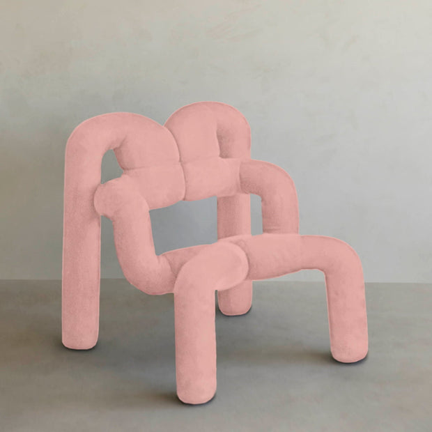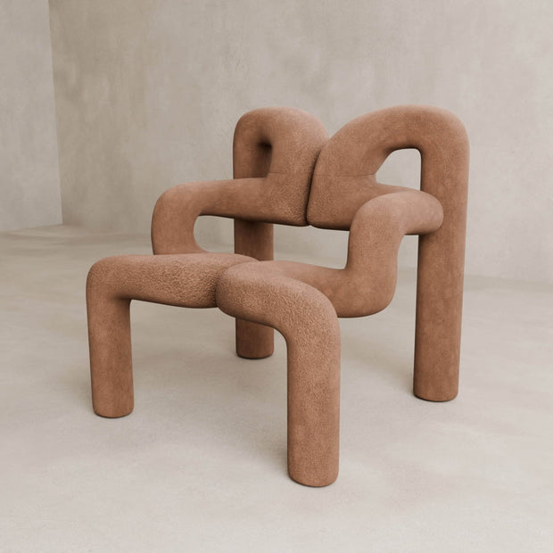 The Spider Chair stands out with unorthodox, neotenic geometry—curving tubular legs and suede upholstery offer a playful yet luxurious seating experience you can enjoy from multiple angles.
