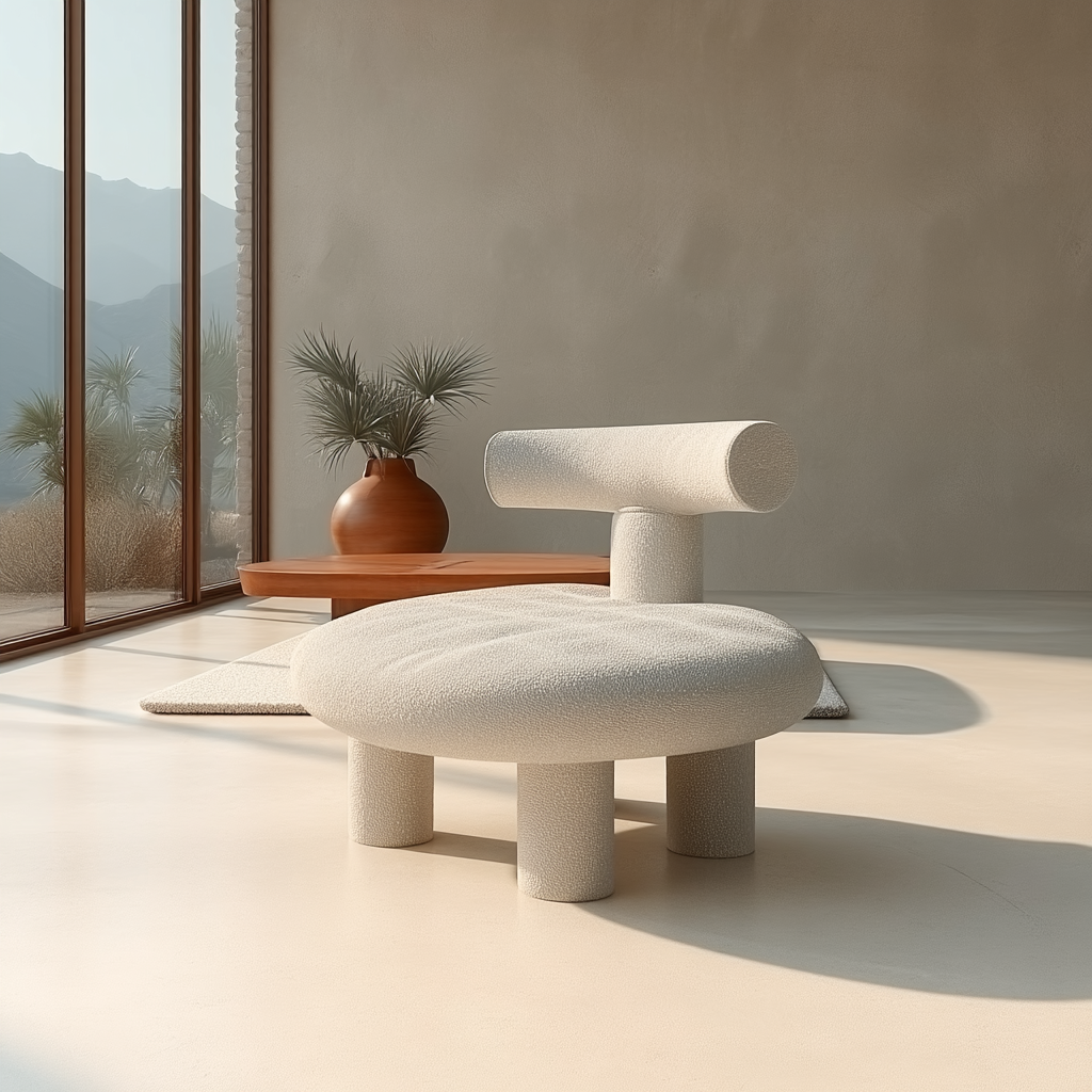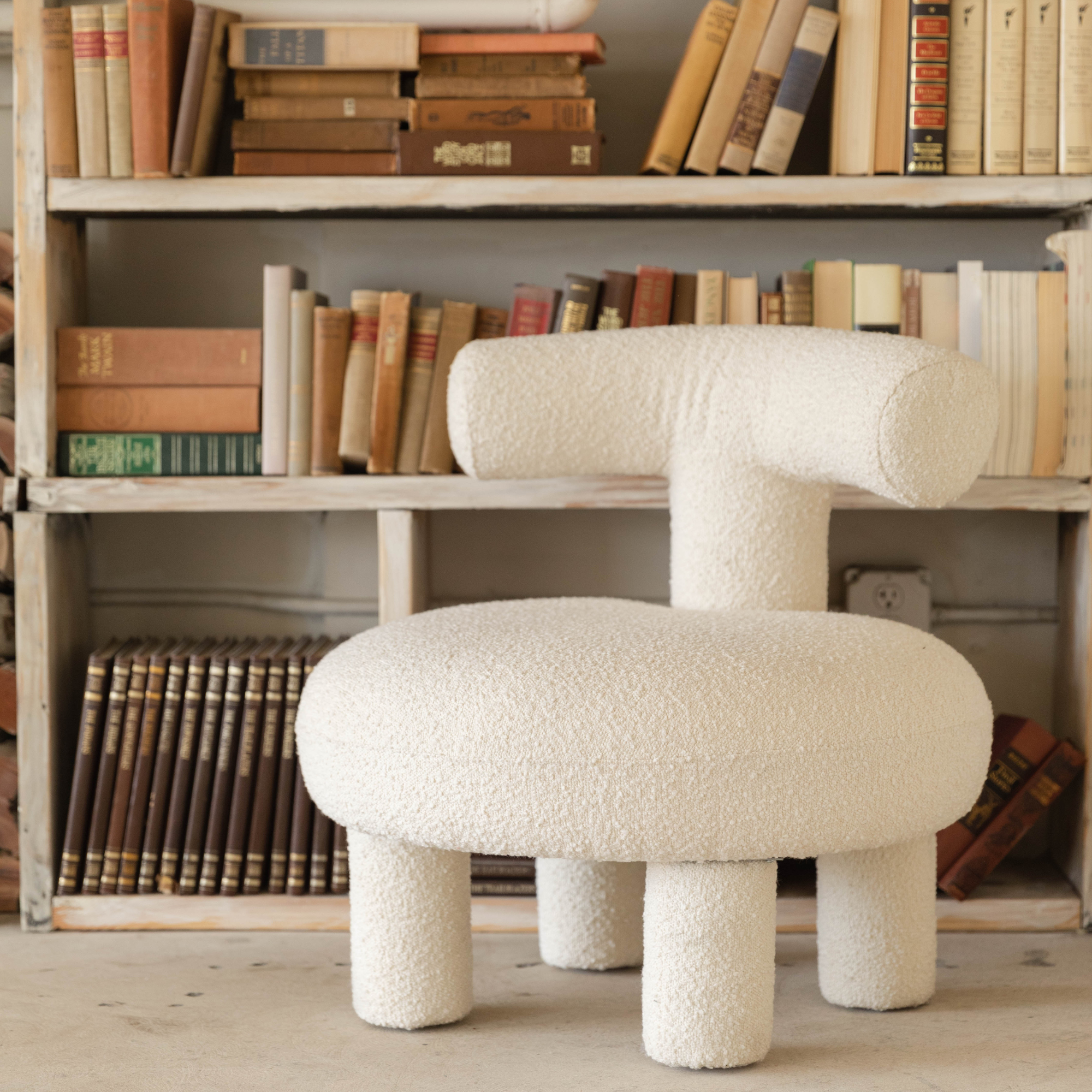 The Teddy Chair features a plush, neotenic bouclé design with a round seat, curved backrest, and cylindrical legs—combining modern luxury with playful, sculptural elegance.