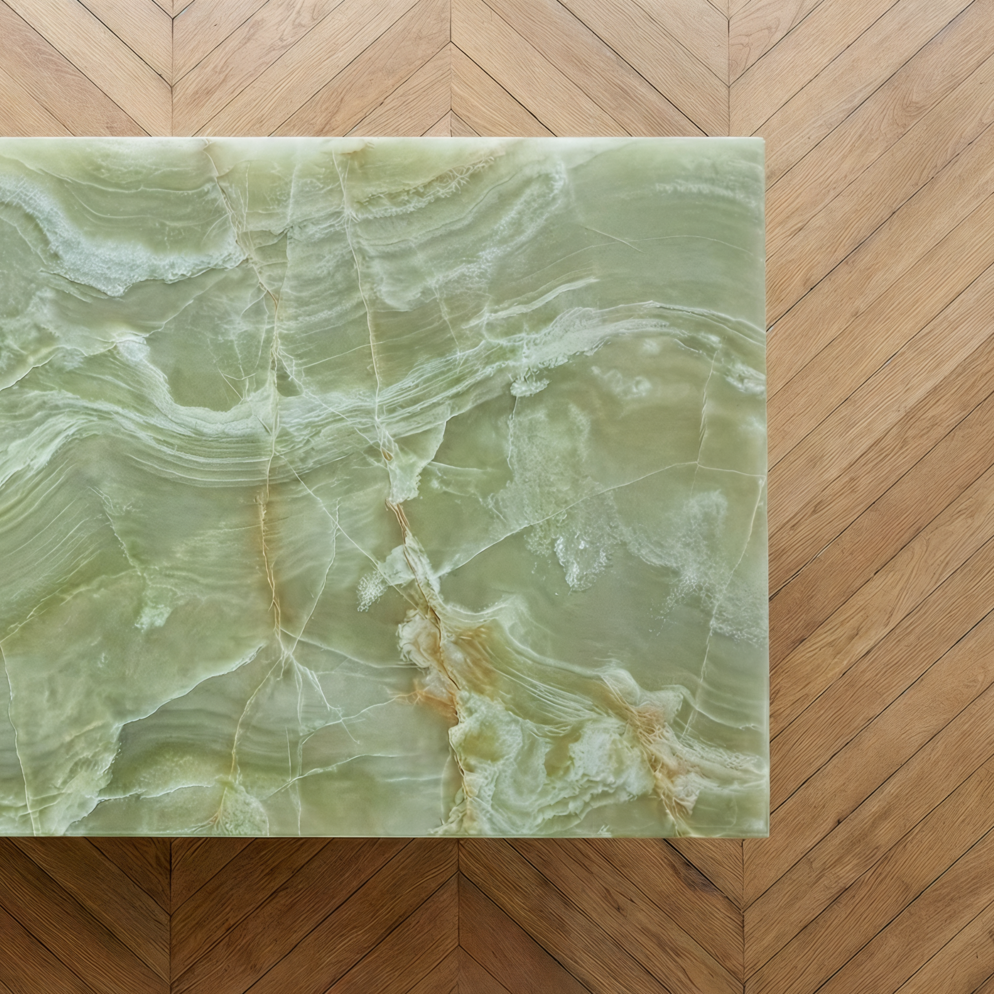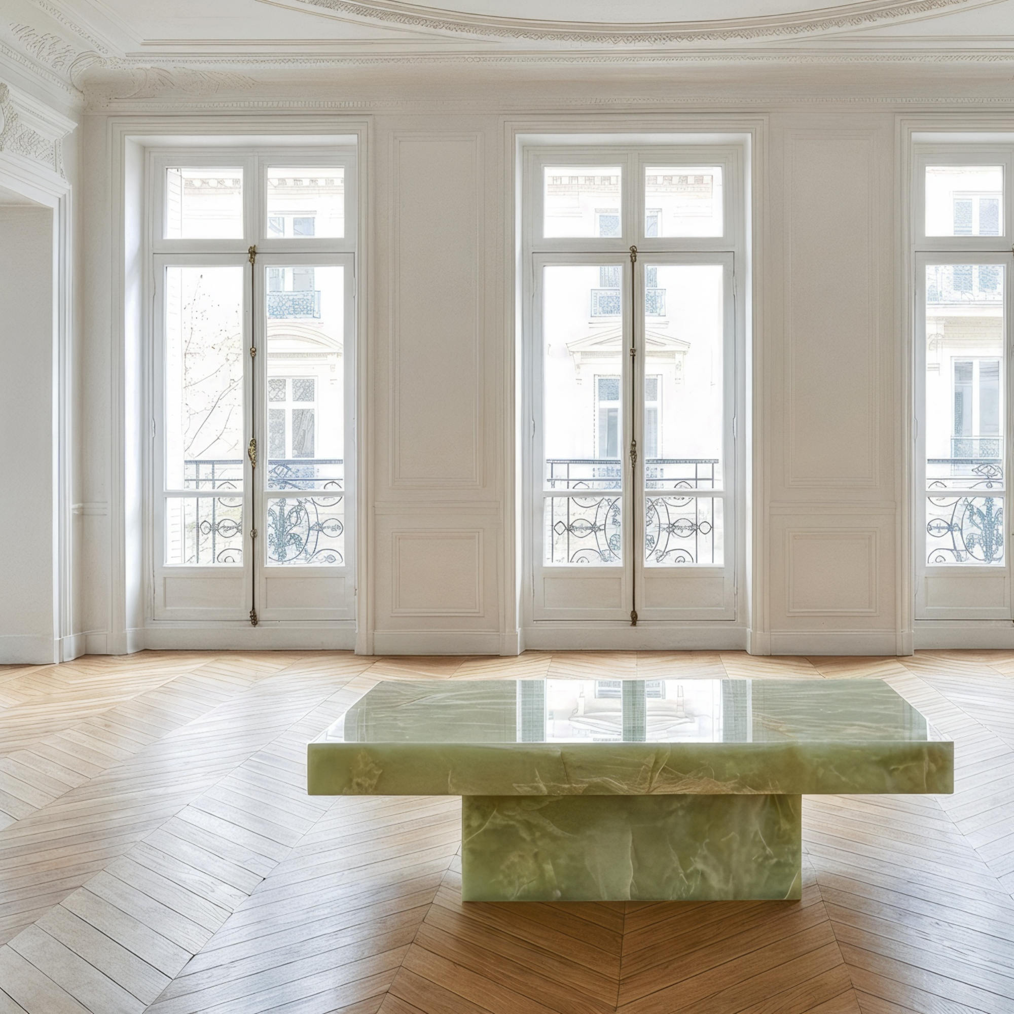 The Vesper Onyx Coffee Table is a striking statement piece crafted from natural green onyx, featuring pale jade and chartreuse veins. Its translucent surface glows gently under natural light, while its bold, geometric form is balanced by a soft organic edge. The floating silhouette gives it a light, airy presence despite its substantial weight.